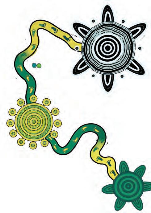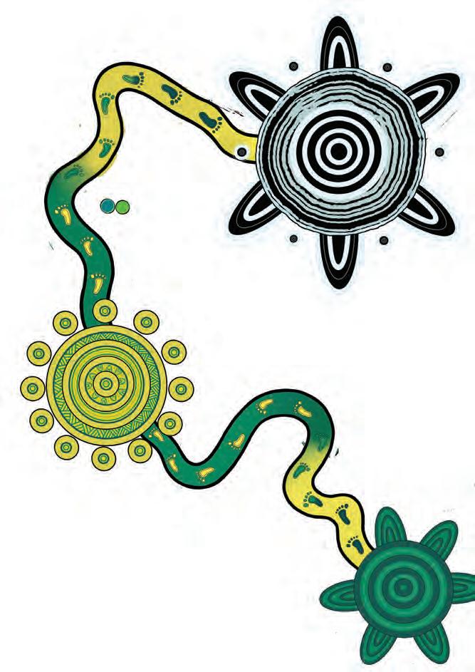 The diamond linework symbolises the resilience and strength of First Nations people. The hands symbolise connection to Country and caring for each other.