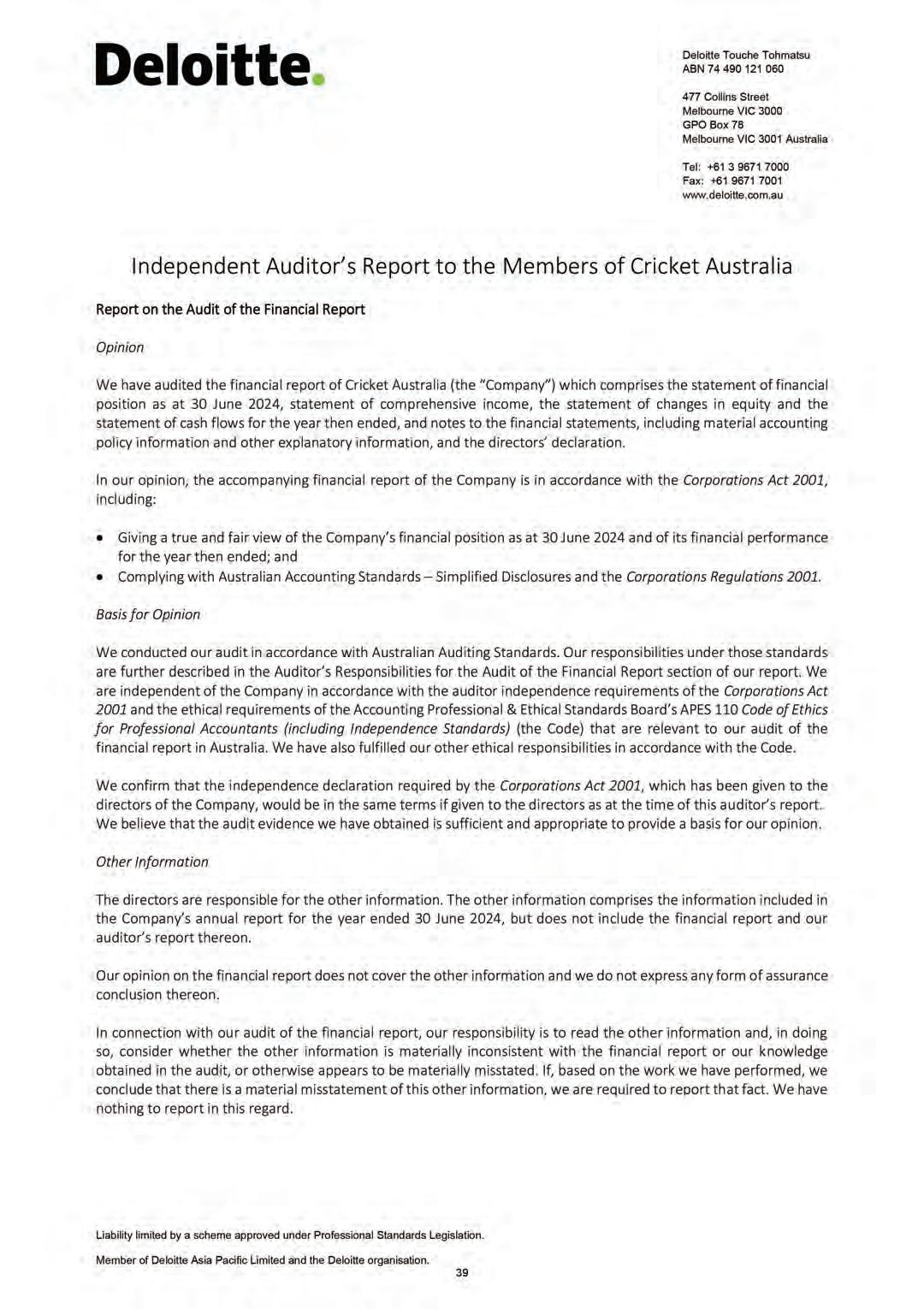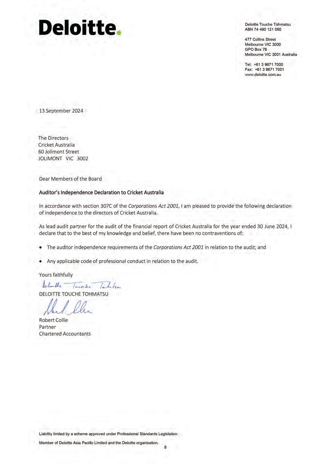 Deloitte Touche Tohmatsu are the auditors of Cricket Australia.