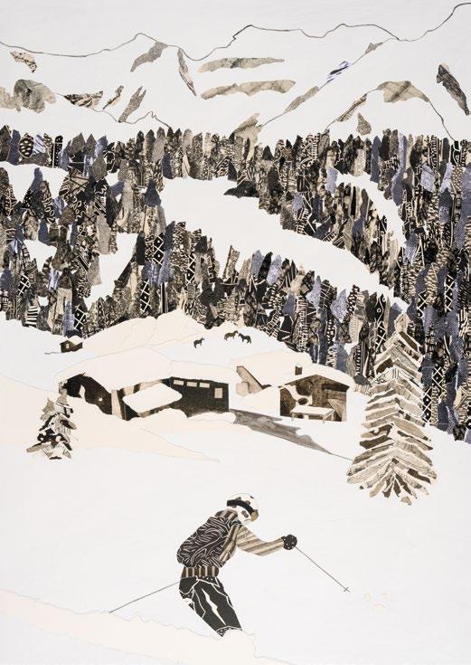 Dione Verulam with The Cake Thief in front of Skiers (2024). Last year, Dione launched a wallpaper collection; two designs appear in the artist’s photograph and the complete collection can be seen on Dione’s website.