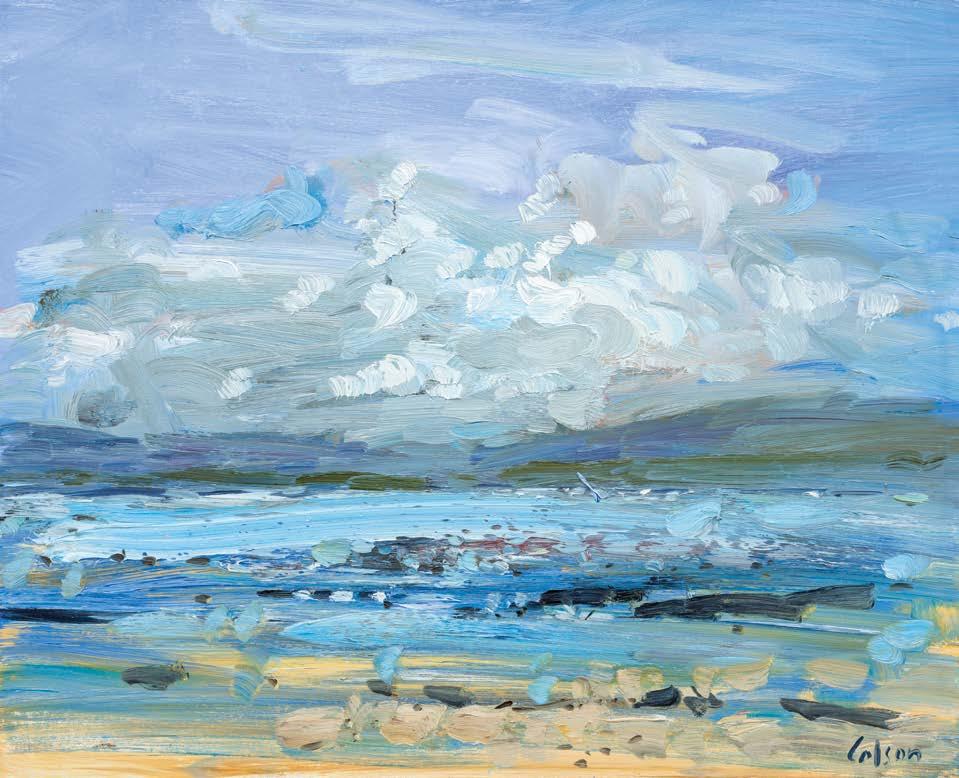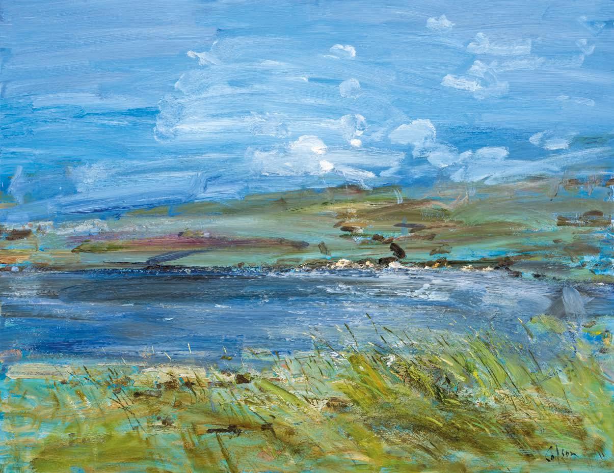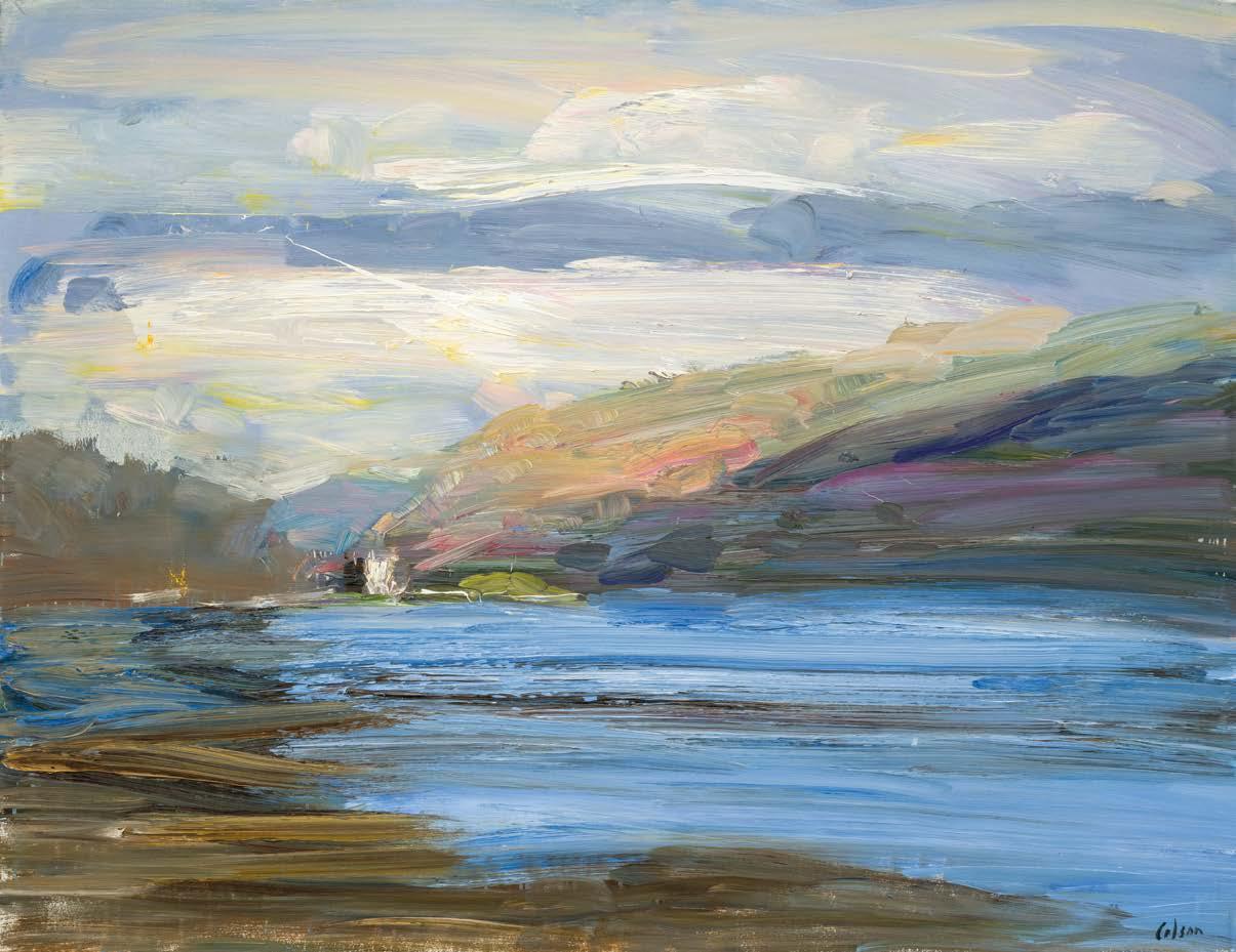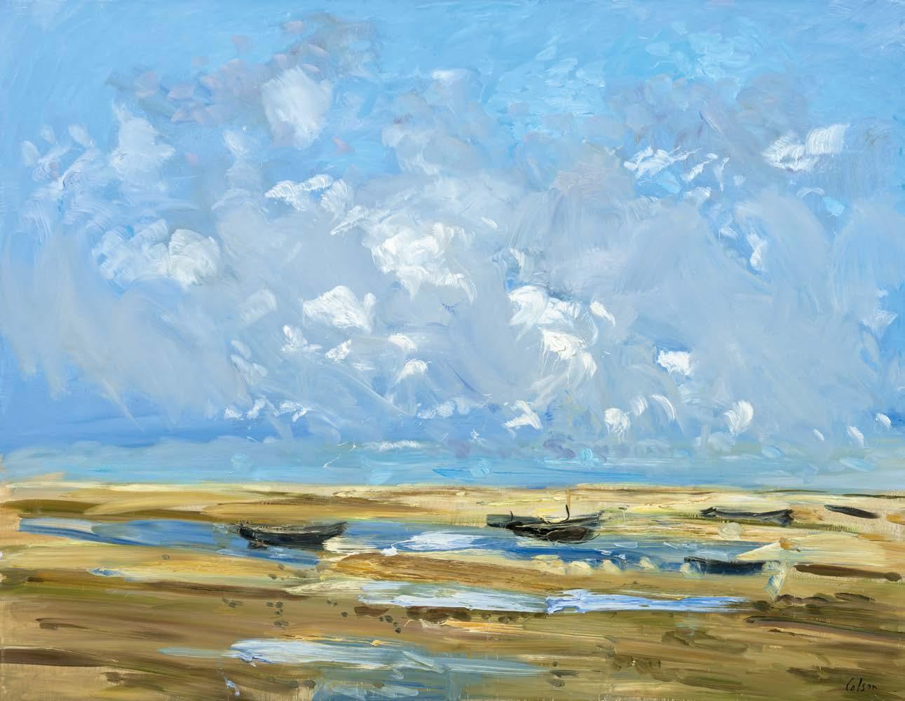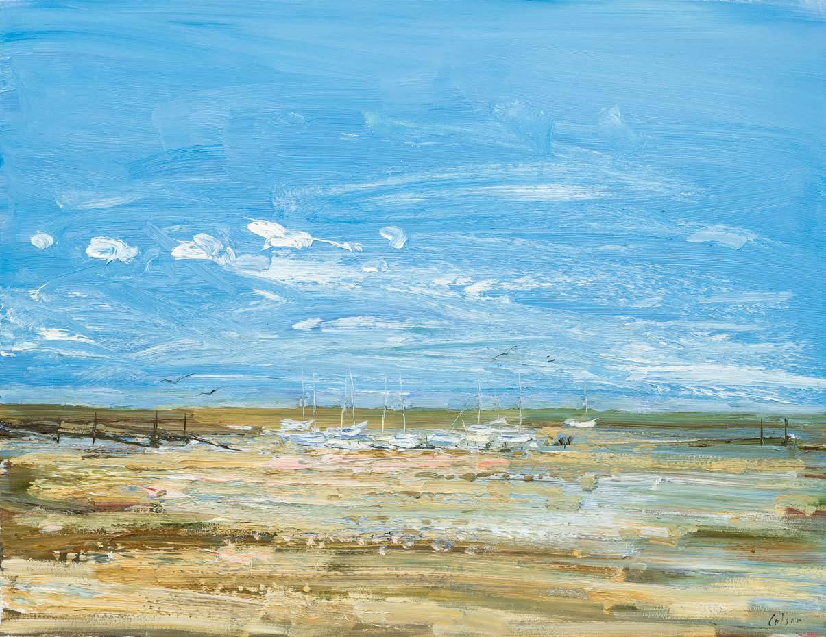 And yet you cannot help wondering why Colson chooses these particular places: that featureless stretch of a mudflat, that empty patch of moor? It’s a bit like freeze-framing, for a moment, a scene from a train window. Why was that spot selected and not the next one? Brushstrokes slide towards edges as if, were there more canvas, they might easily have gone on. It is less the exact locality that appears to interest Colson. It is less some specific view than an elemental interplay of water, air and light. It is not the spirit of place that these paintings conjure. It is the spirit of space.