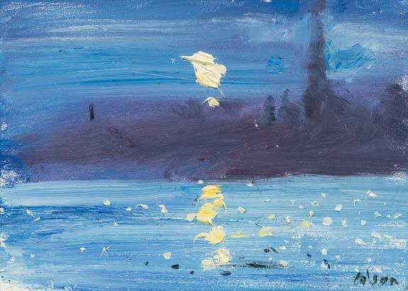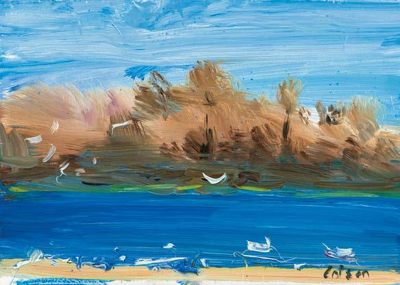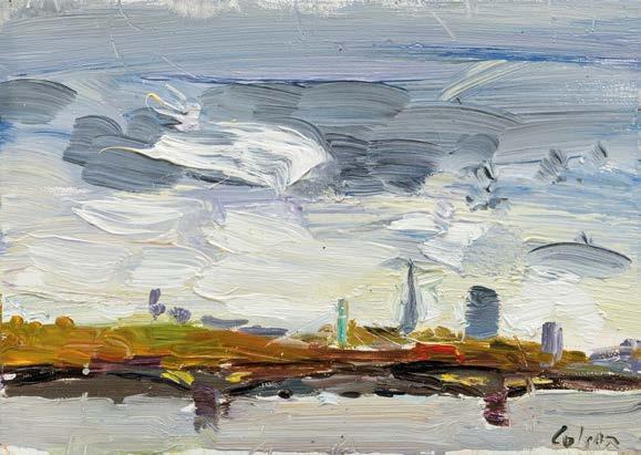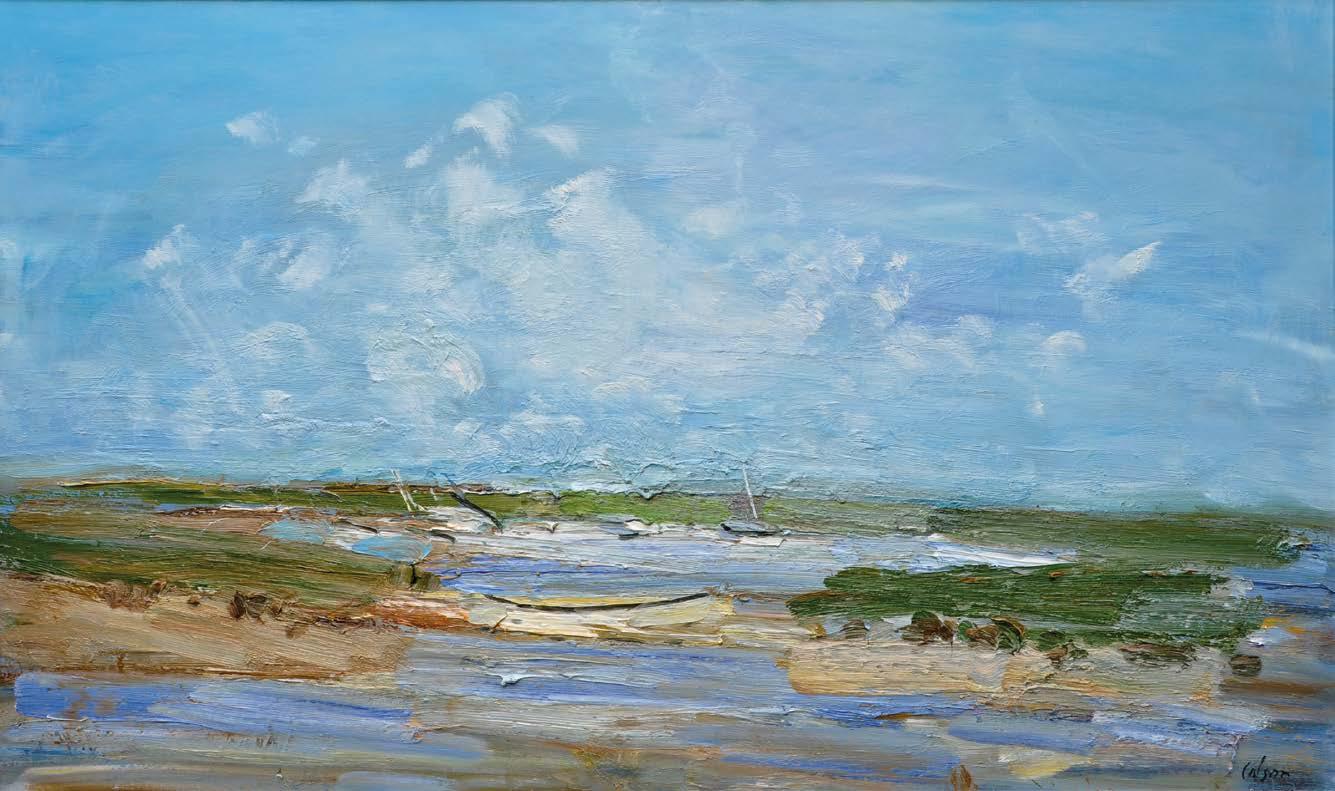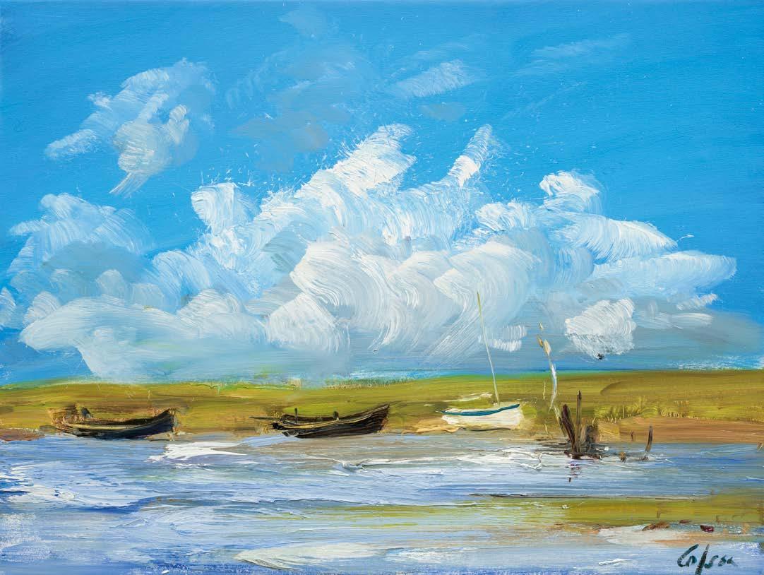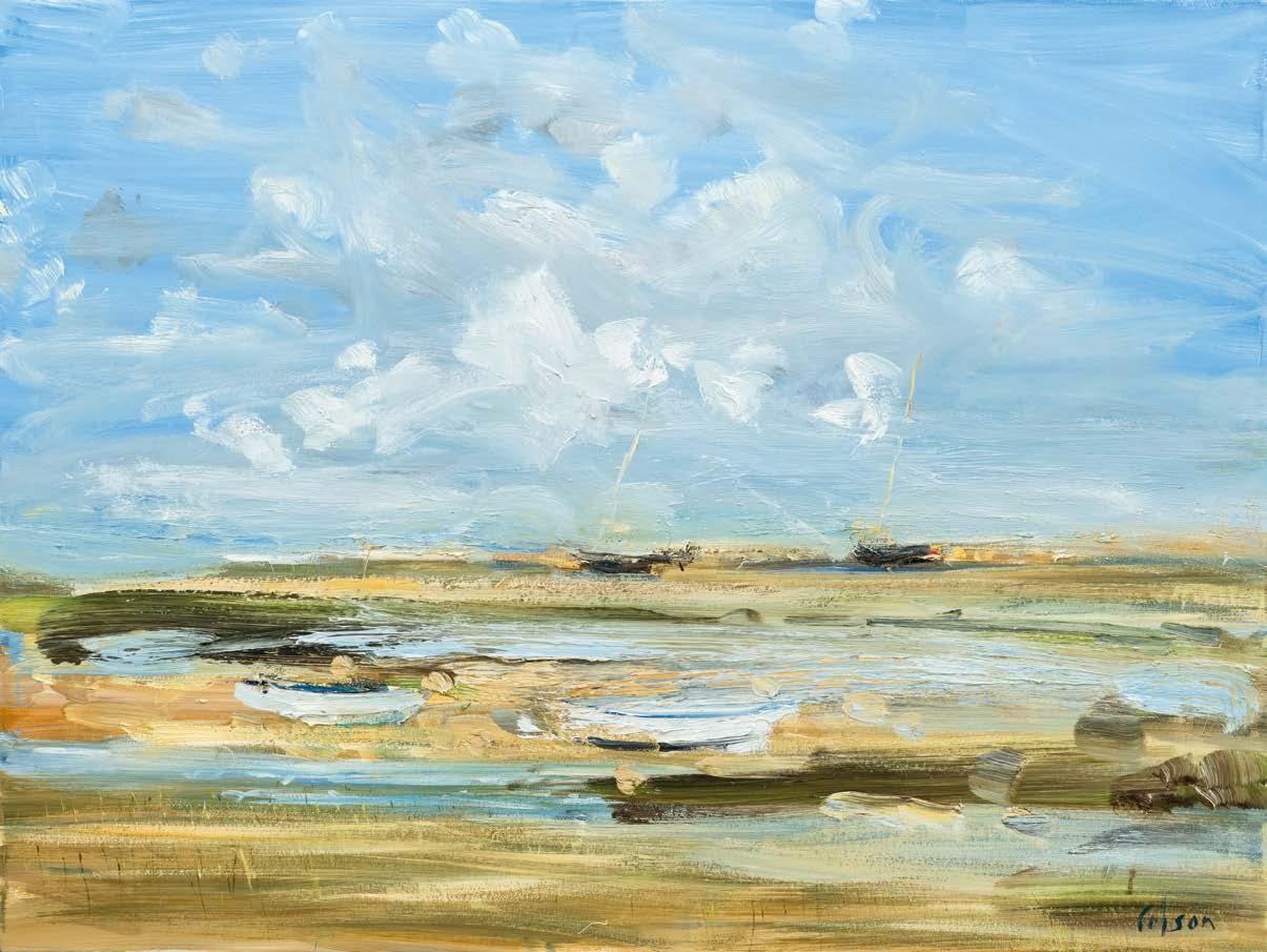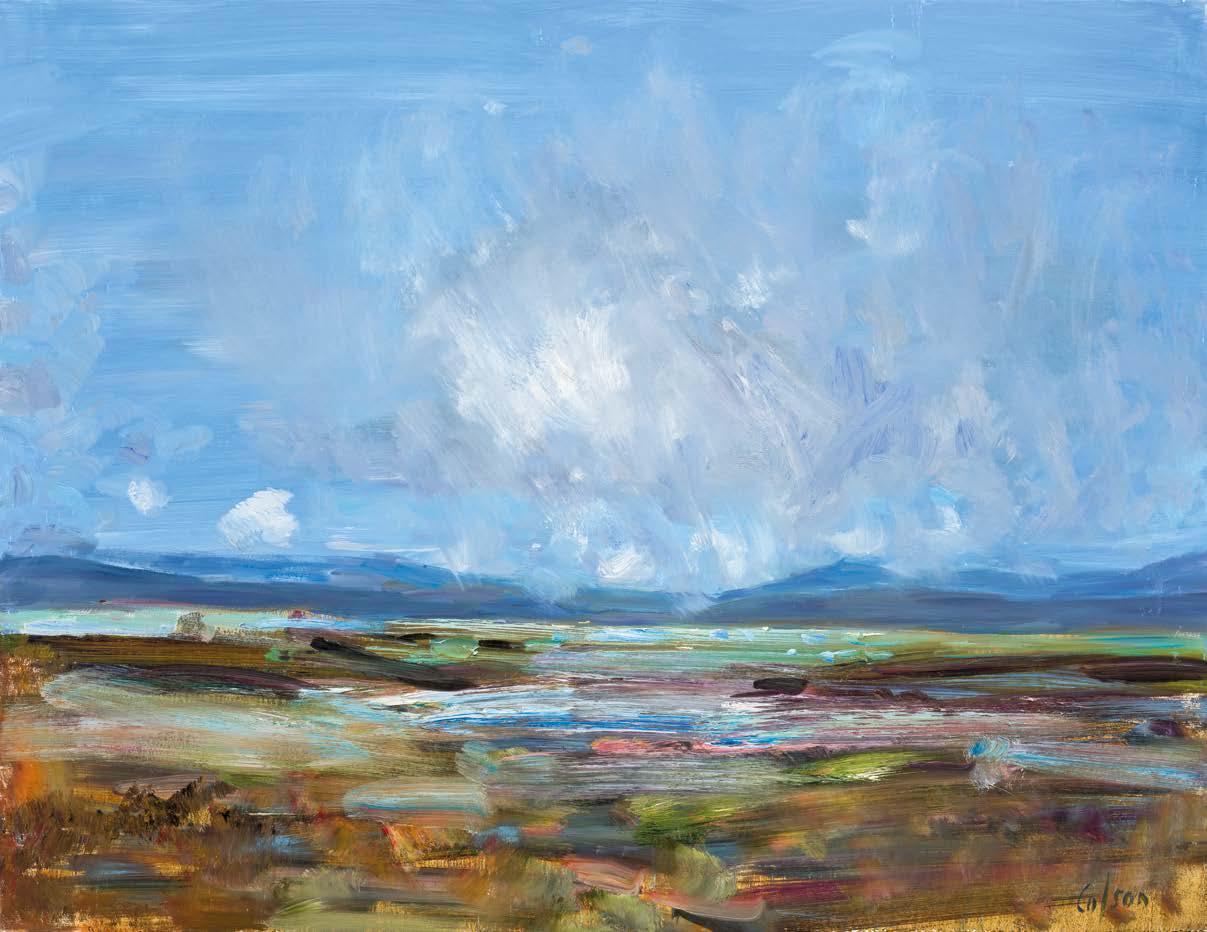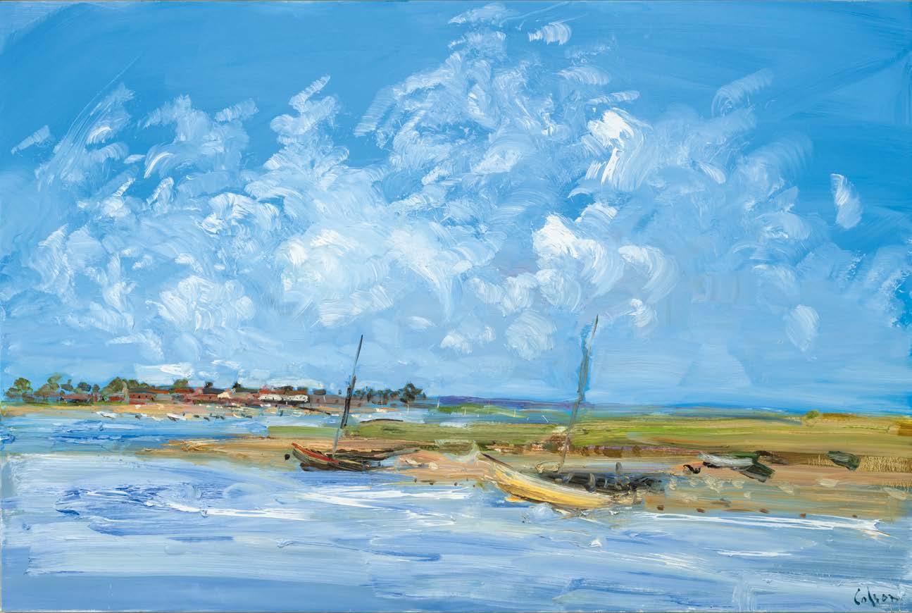 And yet you cannot help wondering why Colson chooses these particular places: that featureless stretch of a mudflat, that empty patch of moor? It’s a bit like freeze-framing, for a moment, a scene from a train window. Why was that spot selected and not the next one? Brushstrokes slide towards edges as if, were there more canvas, they might easily have gone on. It is less the exact locality that appears to interest Colson. It is less some specific view than an elemental interplay of water, air and light. It is not the spirit of place that these paintings conjure. It is the spirit of space.