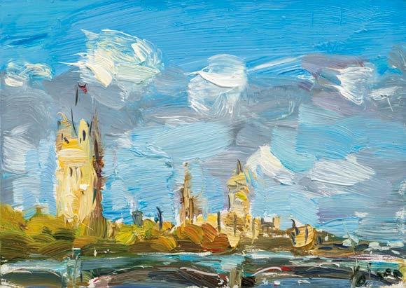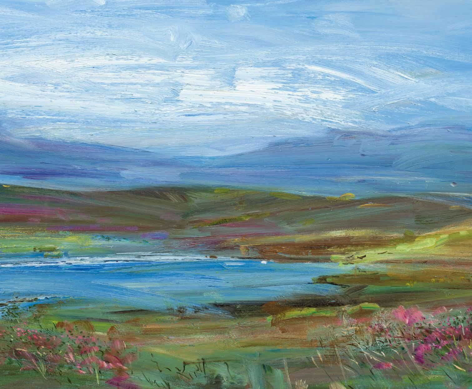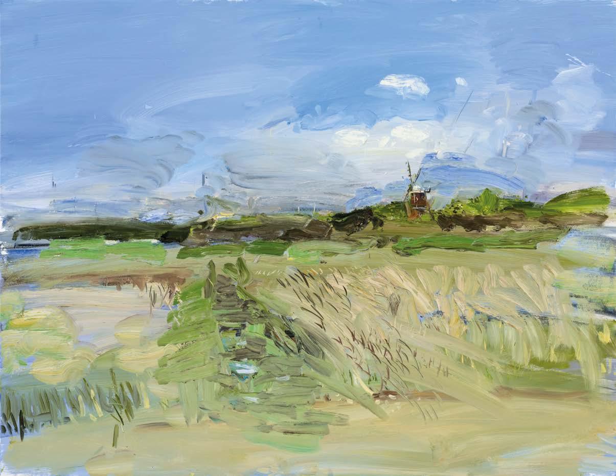 The ostensible subject matter, however, seems mostly secondary. These are seldom obvious views or conventionally picturesque scenes. Rather, they are about the way the light shines on mirroring stretches of water; about how the clouds scud across vast expanses of sky; about windblown brightness and newly awoken colours and the way that a thundery squall might set them athrob.