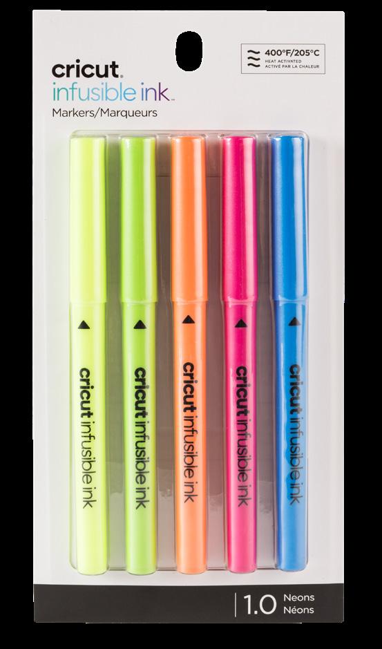 Watch your designs bloom into vibrant, permanent, pro-quality transfers on any compatible Infusible Ink blank when you create with these five neon heat press transfer markers. Draw your designs freehand or use your Cricut smart cutting machine to draw or write your custom design on plain laser copy paper. Available in variety of colors and two different line weights, Infusible Ink Pens & Markers bloom into rich, vibrant hues once transferred using high temperatures. The results are bright, beautiful, seamlessly smooth transfers that never flake, peel, wrinkle, or crack!