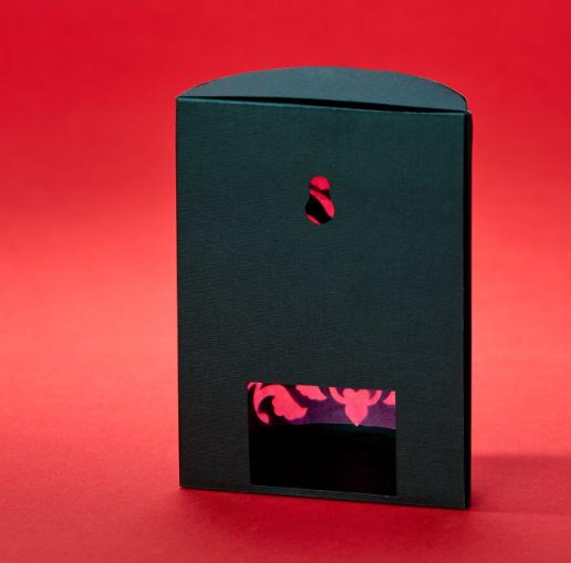 Slide the assembled front piece onto the backer piece. Insert a battery operated tealight through the rectangular opening in the back.