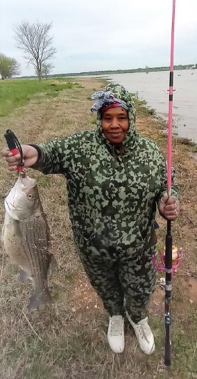 Linda Douglas was sitting around enjoying her afternoon when her husband Andrew told her to grab a pole and lets go catch some fresh air. Little did she know that instead of just catching some fresh air she would end up catching the biggest fish of her life. Turns out it was about a nine pound hybrid striped bass. She caught it with a long pole using shrimp for bait. Most people use shrimp for catfish but in her case the bass was more interested and beat the catfish to the delicious treat. Now the bass has turned into a delicious treat of fillet fish with few bones to worry about for Linda and Andrew.
