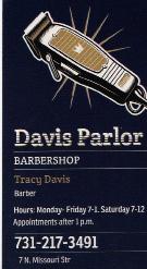 Davis Palor BarBershop Tracy Davis -barber hours Monday-Friday 7-1 Saturday 7-12 Appointment after 1 p.m. 731-217-3491 7 N Misouri Street Bemis, TN CSE News @ #Dollar General #FoodGiant #FoodRite