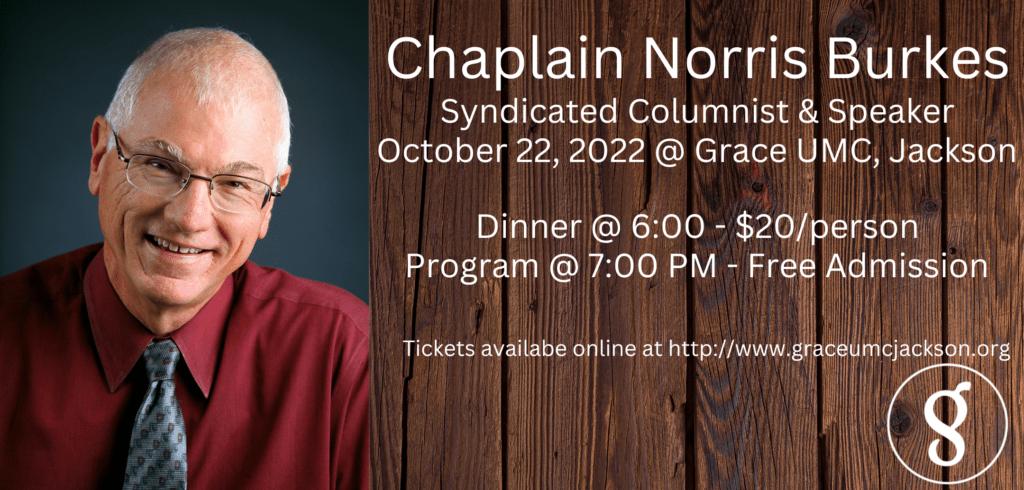 Grace UMC in Jackson, Tennessee will host Chaplain and Syn dicated Columnist Norris Burkes on Saturday, October 22, 2022.
