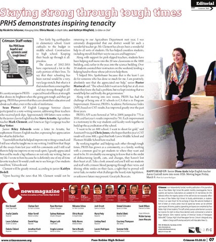 Two fairly big earthquakes in elementary school. Giant Has PRHS been cutbacks to the budget in hopeful and middle school. Construction optimistic amid in high school. Keeping tough times? their heads up through it all: priceless. Yes: 18 The classes of 2012-2015 have experienced a lot in the early portion of their lives. To say that their schooling has No: 6 been normal would be a very, very large stretch. But what is it that makes them come together and stay strong through it all? It’s a unity unique to PRHS— a special brand of Bearcat strength that shines its brightest when the going gets tough and they get going. PRHS has proven that they care about their education and about each other, even in the wake of misfortune. Sean Pierce’s AP English Language Seminar classes participated in a note-writing session, addressing three teachers who received pink slips. Approximately 100 letters were written by the junior class to English teacher Steve Arnette, Agriculture teacher Mark Clement, and American Sign Language teacher Kay Vetter. Junior Riley Edwards wrote a letter to Arnette, her sophomore Honors English teacher, expressing her appreciation for what he did for her. “I just told him that he helped improve my writing so much and I still use what he taught me in my writing. I told him that I kept all the essays from last year with his comments and I still read them to help me improve on my weak spots. I greatly appreciated him and he made a big influence on not only my writing, but on my life. I wrote to him because he is definitely one of my all time favorite teachers! It would crush me to see him go. Our students need him,” Edwards said. Clement will be greatly missed, according to junior Kaitlyn Bedell. “Upon hearing the news that Mr. Clement would not be