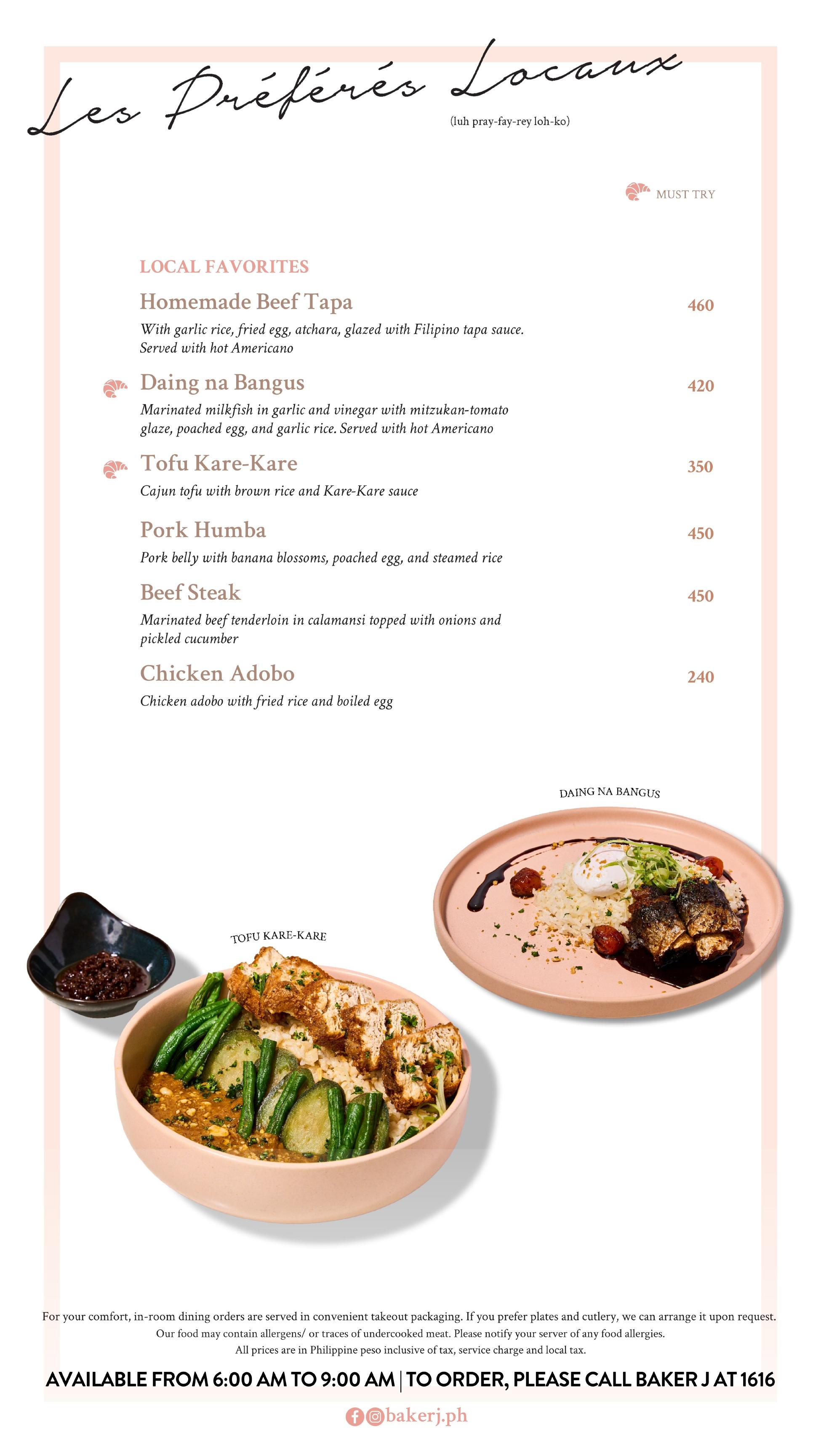 FOOD SAFETY REMINDERS: CONSUME FOOD IMMEDIATELY UPON SERVING. SEEK ASSISTANCE FOR ANY FOOD ALLERGY OR SPECIAL DIETARY REQUIREMENTS PRICES ARE QUOTED IN PHILIPPINE PESO, INCLUSIVE OF VAT, LOCAL TAX & SERVICE CHARGE.
