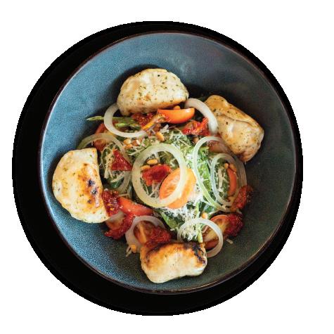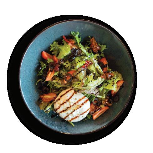 A choice of patty; beef, chicken or pork between a sesame bun with tomato-chili jam, Dijon mayo, assorted salad leaves tossed in balsamic-onions