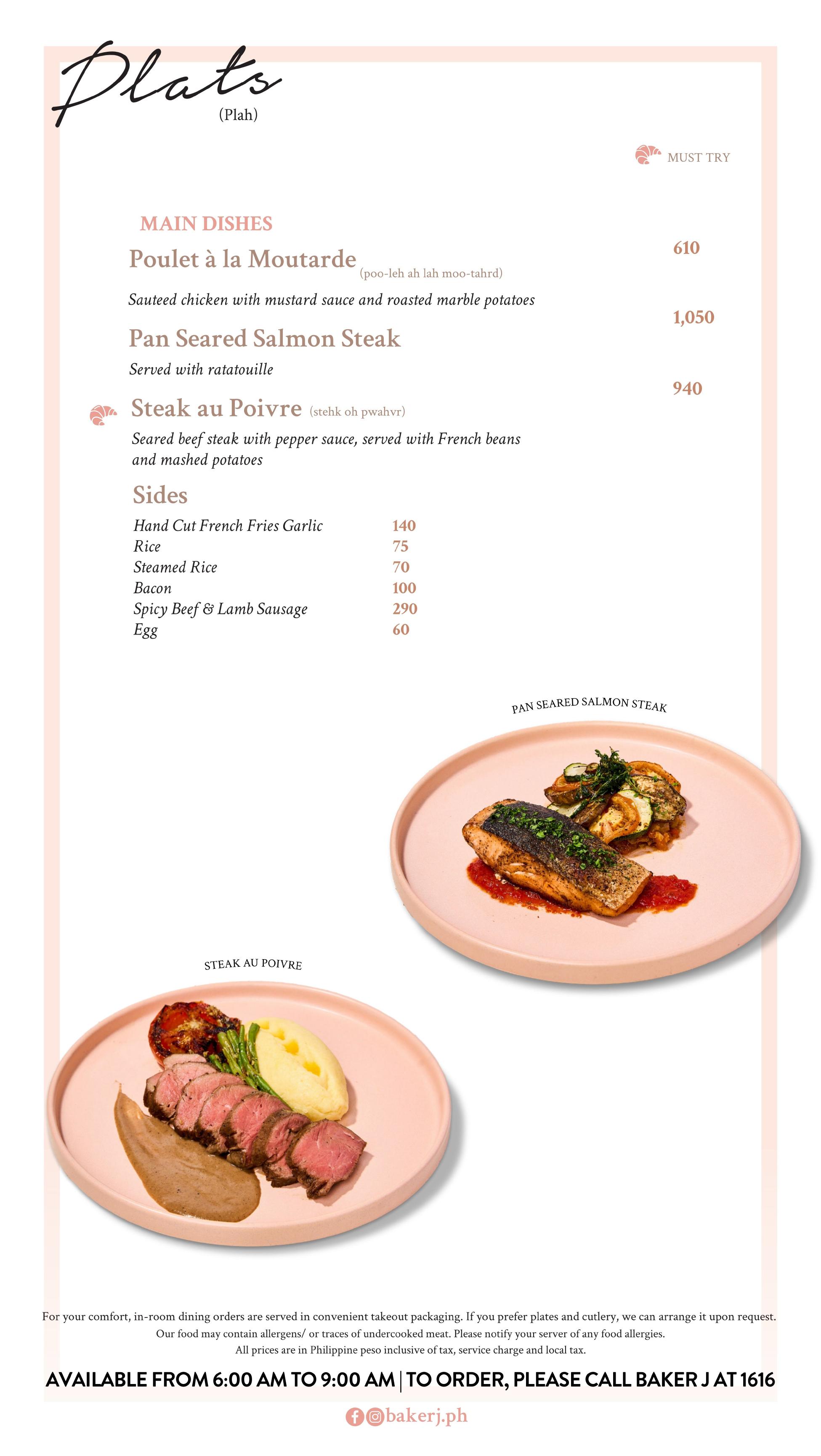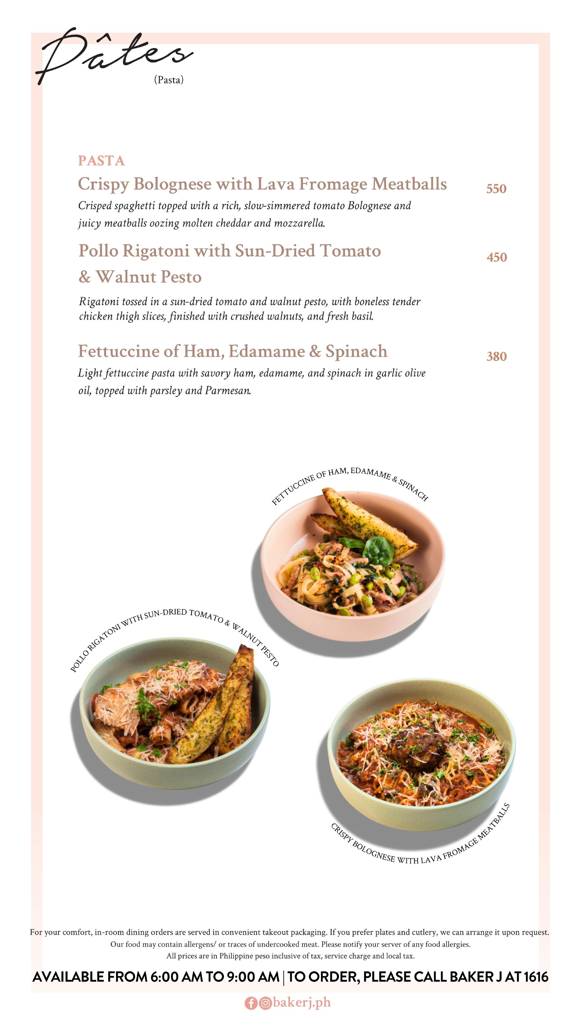 FOOD SAFETY REMINDERS: CONSUME FOOD IMMEDIATELY UPON SERVING. SEEK ASSISTANCE FOR ANY FOOD ALLERGY OR SPECIAL DIETARY REQUIREMENTS PRICES ARE QUOTED IN PHILIPPINE PESO, INCLUSIVE OF VAT, LOCAL TAX & SERVICE CHARGE. TO ORDER, PLEASE CALL IRD AT 1604