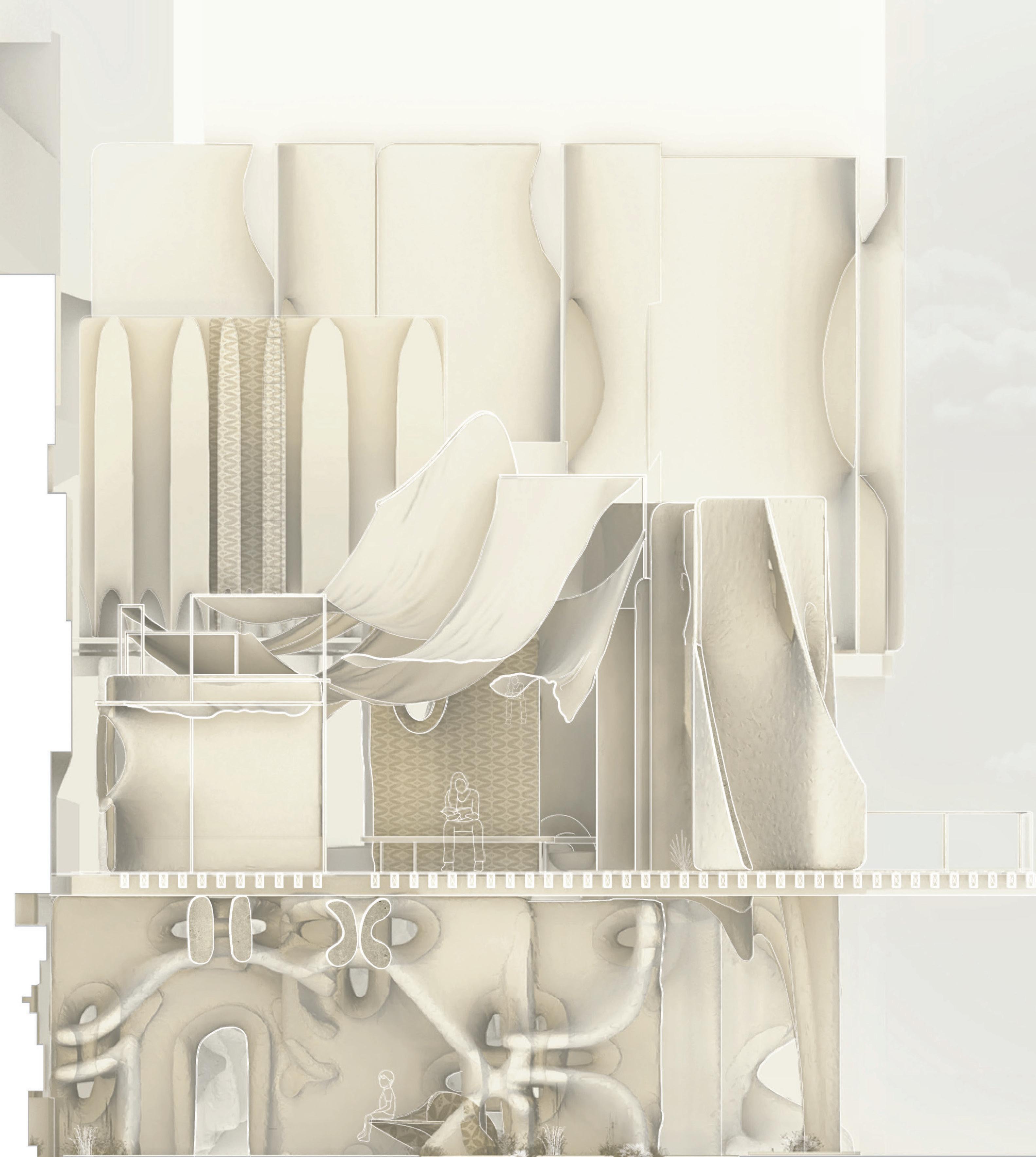 The building offers a refuge and gathering area for the Bedouin who still lead their traditional lifestyle as they journey through the city. The ground level is a place for a market to assist them in maintaining this type of life, while the upper levels contain a Bedouin cafe with fire pits, as well as separate sleeping quarters for men and women.