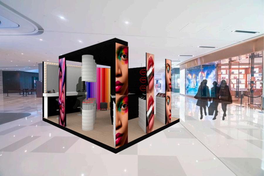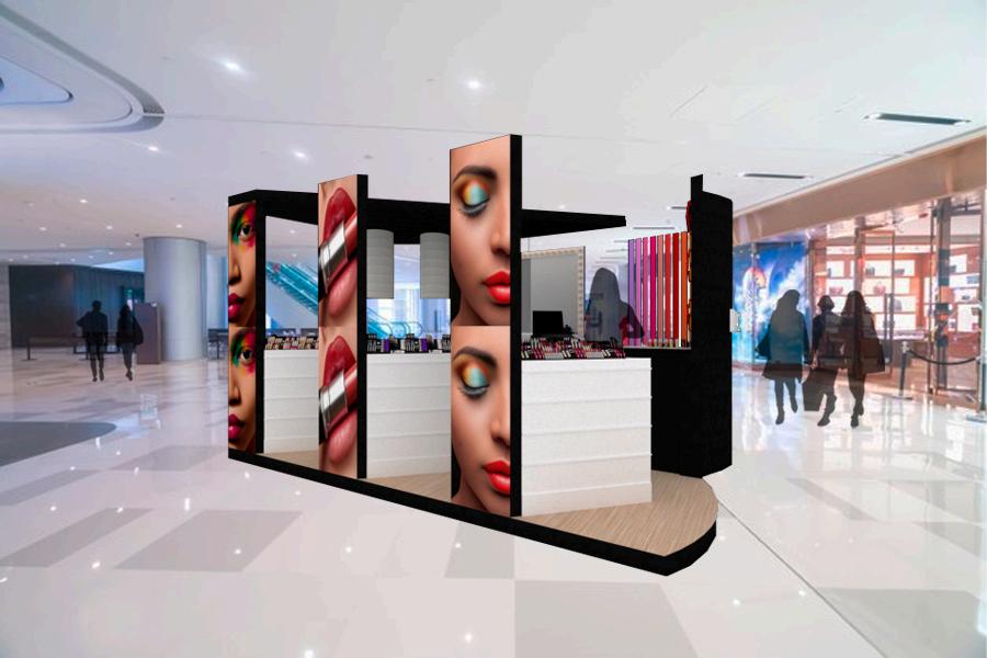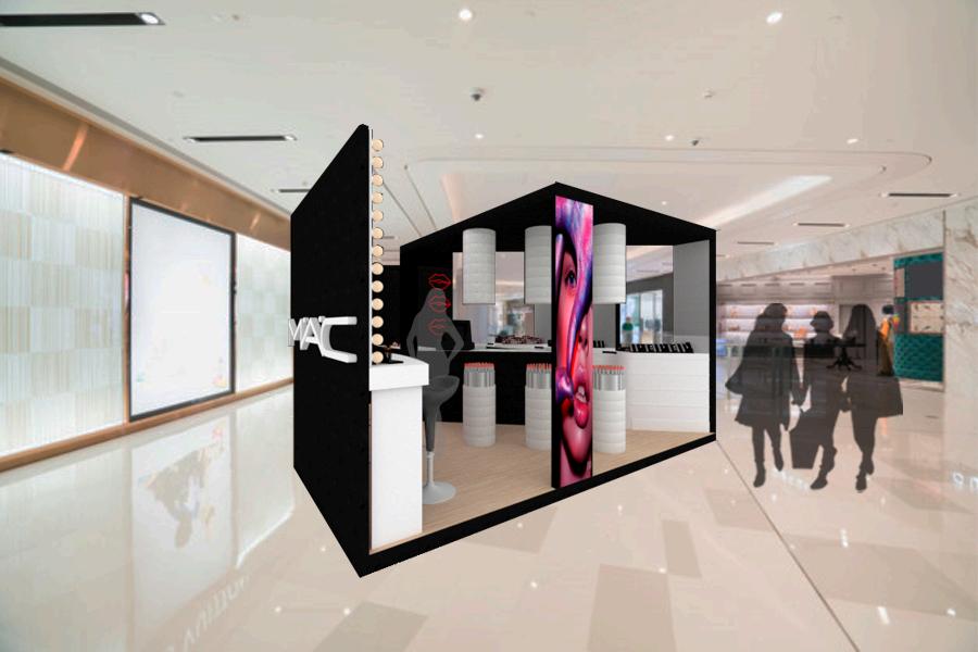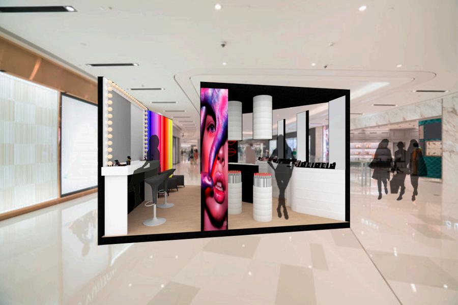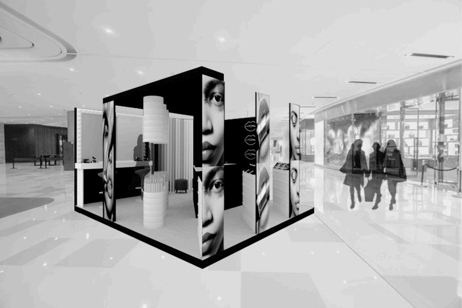 CONCEPT: MAKEUP SHAPES, DERIVED FROM THE PRODUCT S SHAPE AND APPLICATION; THESE SHAPES ARE GEOMETRIC, SINUOUS, AND RREGULAR WITH SMOOTH AND POROUS TEXTURES THIS WAS APPLIED TO THE ARCHITECTURAL LAYOUT AND FURNITURE DESIGN, AS WELL AS THE PANELS FOR ASSEMBLY.