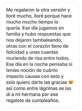 El objetivo del juego es generar conversaciones sobre las luchas, las particularidades y los retos de lo que significa ser una mujer en el siglo XXI. Desde la relación con el cuerpo, las maternidades y el trabajo hasta el envejecimiento, los estereotipos, el aborto y la violencia, esta edición busca fomentar la empatía, el respeto y el cumplimiento de los principios feministas de equidad. GÉNERO COMPRAR -AQUÍ-