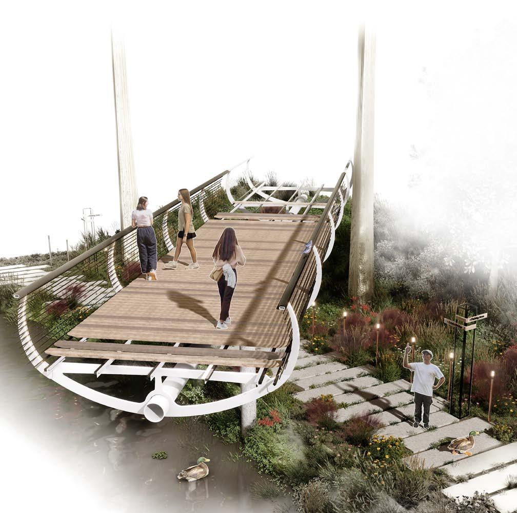 Curved and meandering paths guide visitors through the site, with each route offering a unique experience. One path crosses the bridge and serves as a shortcut, while the other, which passes beneath the bridge, is longer. The two paths differ in materials and width, providing contrasting sensations and allowing visitors to engage with the landscape in different ways.