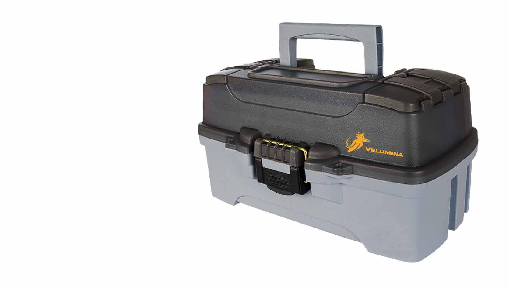 Caja de aparejos plástica para pesca con tonos negro y gris estándar.