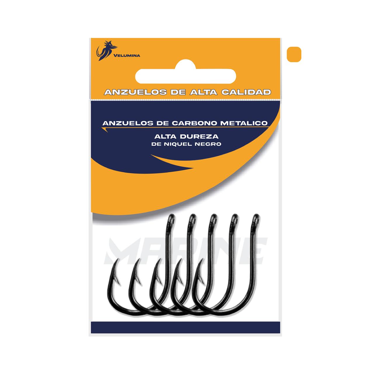 Paquete de anzuelos de carbono metálico tipo pulpo de color negro grafito con alta dureza.