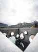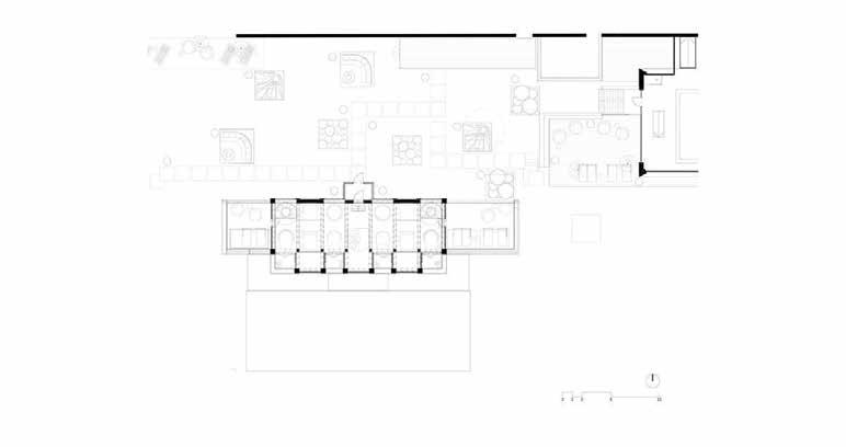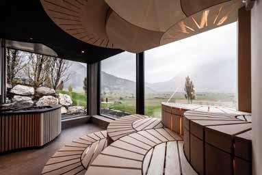 La nueva estructura de vidrio y cemento fue cuidadosamente construida de forma orgánica en una suave pendiente. Desde esta posición privilegiada, ofrece una vista panorámica única del espacioso valle. La nueva zona de bienestar se despliega en una expansión de 600 m², destacando una infraestructura techada erigida desde cimientos y una zona al aire libre con piscina. Esta última, conecta ambos edificios mediante una extensión central hacia el spa. La estructura de vidrio y cemento se proyecta horizontalmente para formar una inclinación artificial, la cual encuentra su eco en los muros de piedra seca.