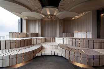Aunque la estructura exterior se define por líneas y formas marcadas, sus rasgos se suavizan y vuelven más orgánicos una vez que el espectador entra en el edificio. Las zonas de relajación fueron diseñadas para transmitir la sensación de estar en un escenario teatral con vistas a la gran montaña que se encuentra delante. Este enfoque no solo realza la conexión con el entorno natural, sino que también brinda una experiencia estética y sensorialmente.