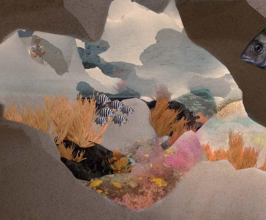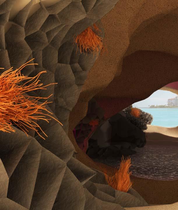 The erosion creates a set of interconnecting subterranean caves that can be explored by the human and non humans. The caves open up to a series of lagoons that contain pools of sea water. Here is where the corals begin the process of taking over the site. With the help of the artificial growths, these caves and lagoons become spaces where corals and marine life will take over as time passes.