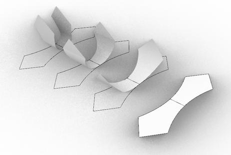 Other example of moldless structures is the Curved Foldable Tailored Fibre Reinforcements project In this project, complicated three-dimensional shapes through a flat reinforcement underwent resininfusion subsequently being curved and folded into a spatial object before solidifying The structural stability was achieved by the use of geometries with closed crosssections, this was possible by choosing the use of TfP as a resource-saving additive fabrication technique, as this method permits the deposition of precise fibres, and enables