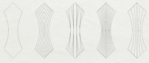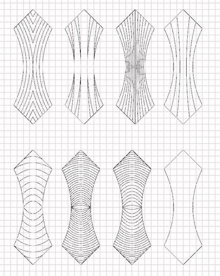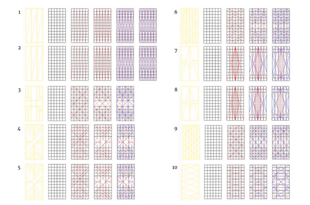 Our objective lies in deviating from the prescribed curved and folded outcomes outlined in the book, aiming instead to introduce specific bending zones within our patterns By incorporating the selected patterns, implementing a defined grid, and introducing tailored modifications, we have successfully generated new alternative patterns These patterns, outlined below, serve as our initial testing ground to observe and understand how bending behaviours unfold