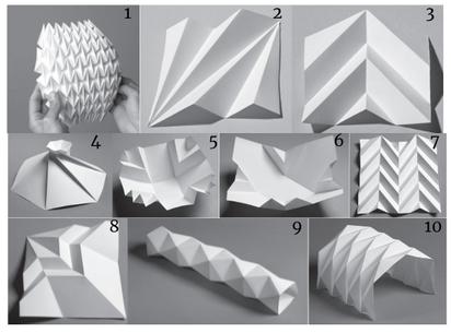 In our pursuit of initiating experimental designs to assess foldability, an extensive exploration of folding techniques led us to delve into the book "Folding Techniques for Designers" by Paul Jackson (39). This comprehensive resource focuses on folding methodologies capable of transforming twodimensional sheets into three-dimensional forms. The book elucidates fundamental techniques, such as pleated surfaces, curved folding, and crumpling, providing a robust foundation for our research.