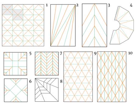 2 1.Symmetrical Repeats: Glide Reflection, 2. Stretch and Skew: Stretch, 3&4. Stretch and Skew: Stretch,, 5&6. V-Pleats: VariationsCoexisting Vs, 7. V-Pleats: Multiple Vs - Making by Hand, 8. V-Pleats: Multiple Vs - Variations, 9&10. Spans & Parabolas: X-form Spans