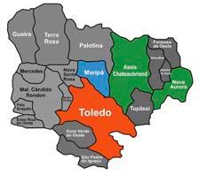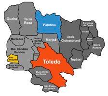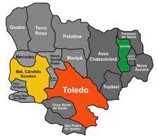 Toledo, Marechal Cândido Rondon, Palotina, Guaíra, Assis Chateaubriand, Jesuítas, Tupãssi, Terra Roxa, Nova Santa Rosa, Nova Aurora, Iracema do Oeste, Entre Rios do Oeste, Pato Bragado, Mercedes, Quatro Pontes, São Pedro do Iguaçu, Ouro Verde do Oeste, Formosa do Oeste e Maripá.