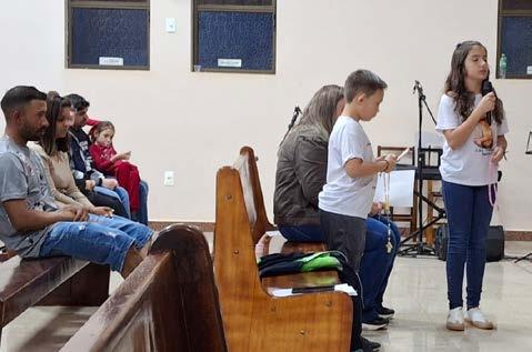 Maria Crepusculli Roos canta com o avô Edward Crepusculli, em celebração que prestou homenagens ao Dia dos Avós na Igreja Matriz da Paróquia São Francisco de Assis, de Toledo. Quem assistiu, se emocionou – Foto: Pascom