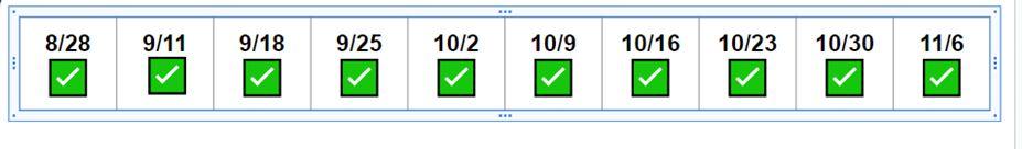 Throughout the quarter students Q1 Timecard goes down for each time card either submitted late (red box) or not at all (orange box).