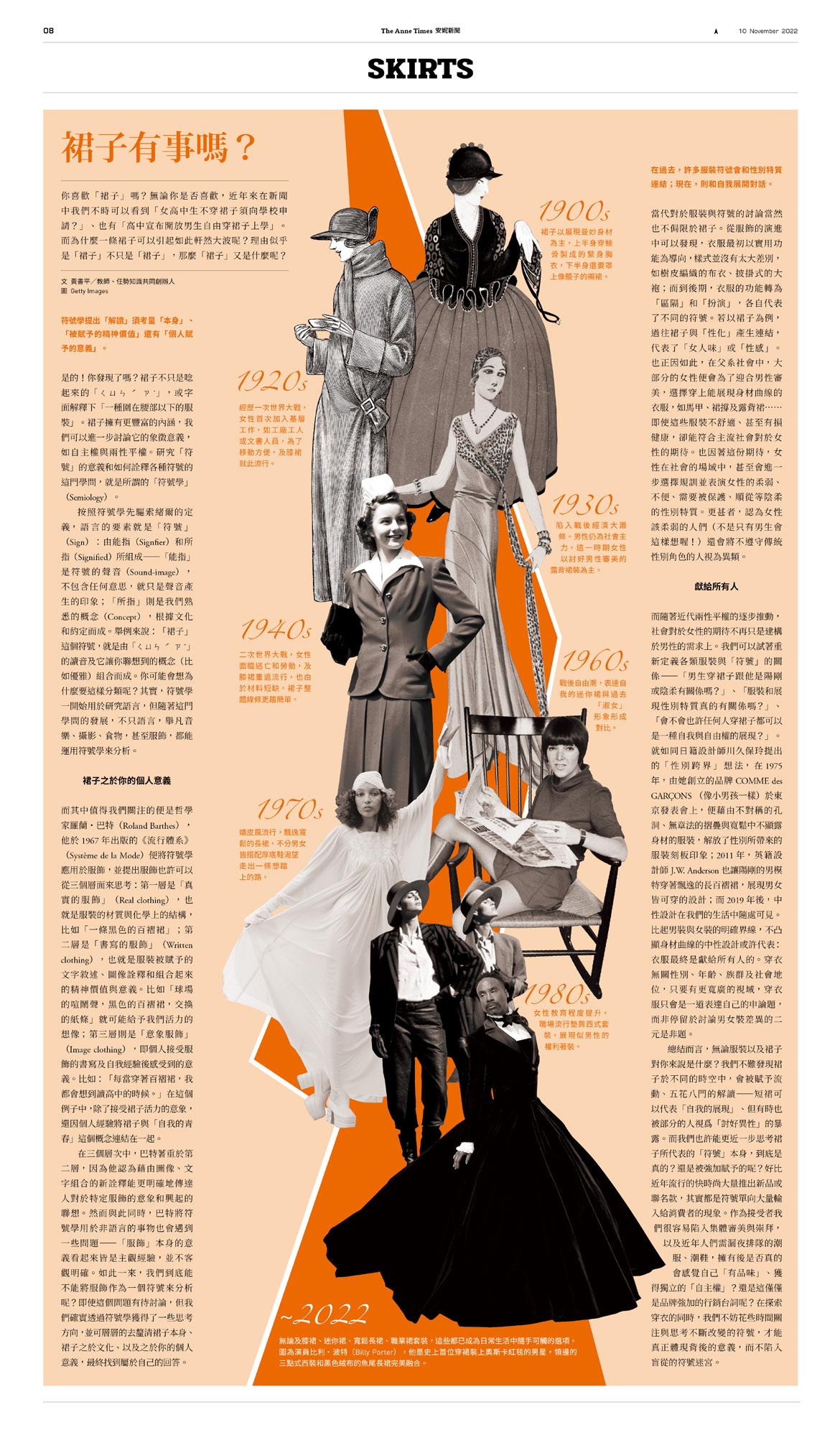 The Anne Times GuideBook & WorkBook 50 Part 4 《 裙子有事嗎 (本篇報導出自《安妮新聞》第14期) 本期的 安妮新聞 不僅只討論服裝 也同時藉由此議題探討自我的認識與探索 服裝之於人類是非常重要的日常配件 在現代是如此地自由 多元與隨手可得 也因為如此理所當然 也漸漸忽略了衣著背後的許多細節 例如設計 機能 美感 時代感 以及其所傳遞出來的意象 衣服不只是穿在身上的織物 裙子也不只是一條裙子 本篇內容藉由 裙子 這個單品 以及哲學家羅蘭 巴特提及的 符號學 來探討裙子的沿革 裙子因應各種文化的改變 裙子呈現的意象 以及關於裙子跨越性別二元性的更多可能 建議在藝術領域 生活領域 社會領域 歷史與文化 綜合領域 輔導科 相關等課程當中 搭配不同主題 藉由此專題文 章延伸入門各種學問 課堂學習領域建議 * 裙子在不同的文化中 都有不同的呈現和演變 建議老師們可先準備各式跟服裝歷史相關的資料 透過本篇內容的 探討 延伸閱讀服裝因應人類生活的改變 是人類學 也是服飾文化的探索 * 除了人文以及符號學以外 裙子的各種樣式 也可作為結構探索的學習 例如二十世紀初西方的女性裙子 因為以