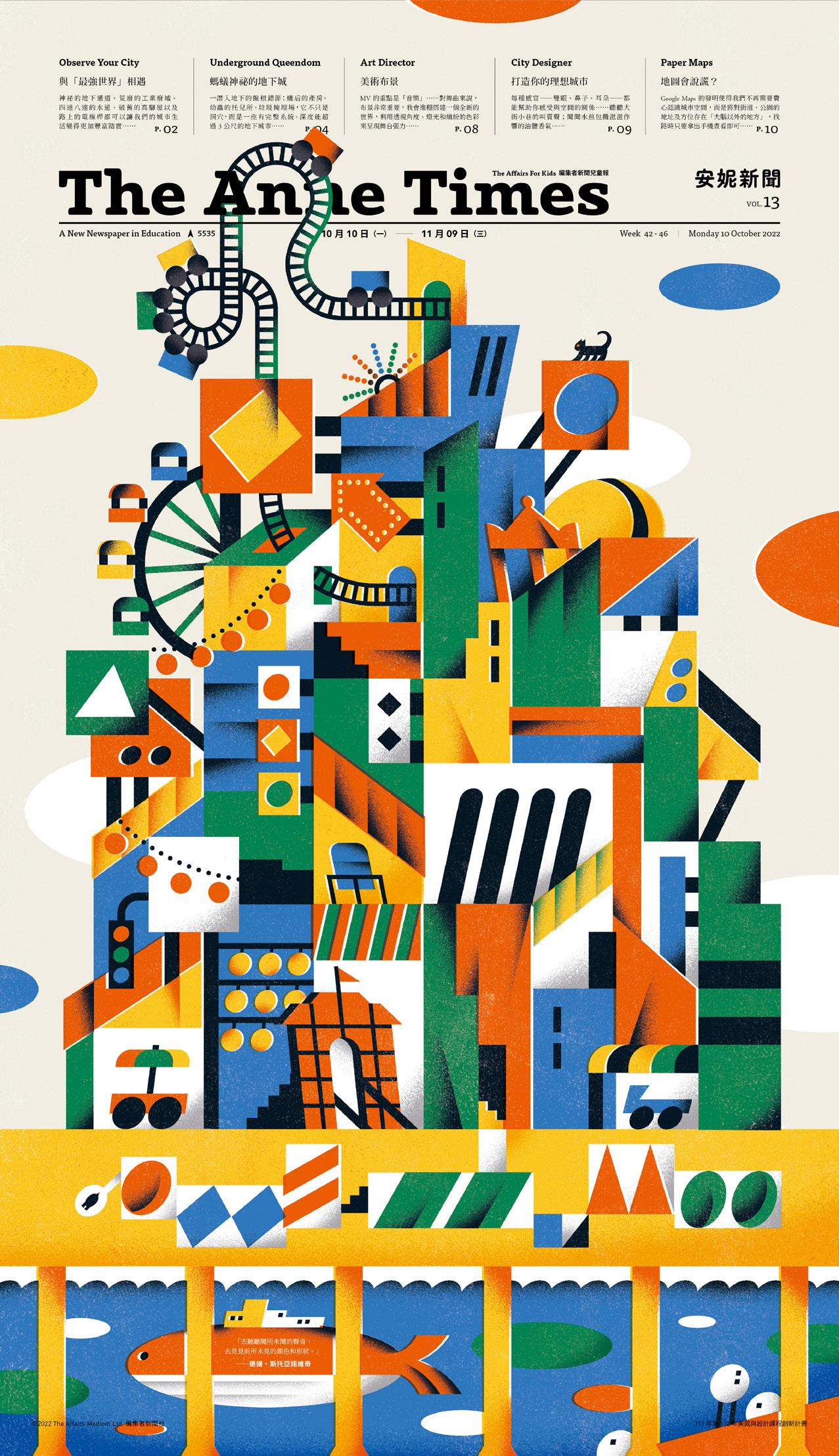 色彩/質感/比例的發現體驗 藉由不同的設計出發點 帶領學子重新看待報紙這個載體 在拿 到 安妮新聞 時 觸覺能先感受到這份報紙的紙張 從紙張的 厚薄 質地與觸感了解 質感 是什麼 也能從封面與整份報紙 中的各種圖片 插畫與用色看見各種色彩的組合與協調呈現 而 報紙當中 每一頁的內容與圖文分配 不同版面的規格與尺寸 來認識 比例 在任何事物中的重要性 這些細節都關乎美感與 感受 同時也為學子打開新的學習視野