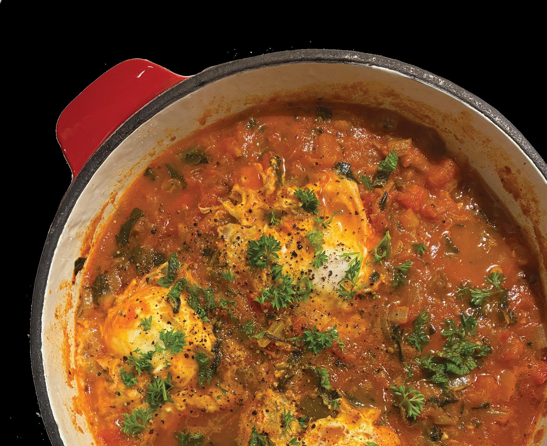 Step 6. After this, make small egg-sized holes in the tomato and crack an egg into each. Place the lid onto the pot and simmer over low for approx. 6 mins or until the egg whites are solid, and yolk served to your liking.