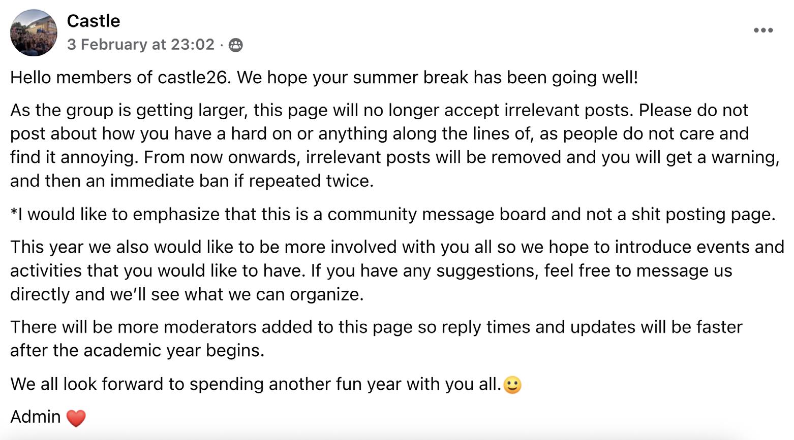 As a particularly prolific anonymous member liked to call it, this was “prime Castle25”. But as Castle25 became Castle26, and the student quarter slowly began to show signs of life once more, an admin post on February 3rd changed everything. The admins announced that Castle26 was a “community message board”, not a “shit posting page”. “As the group is getting larger, this page will no longer accept irrelevant posts. Please do not post about how you have a hard on or anything along the lines of, as people do not care and find it annoying”.