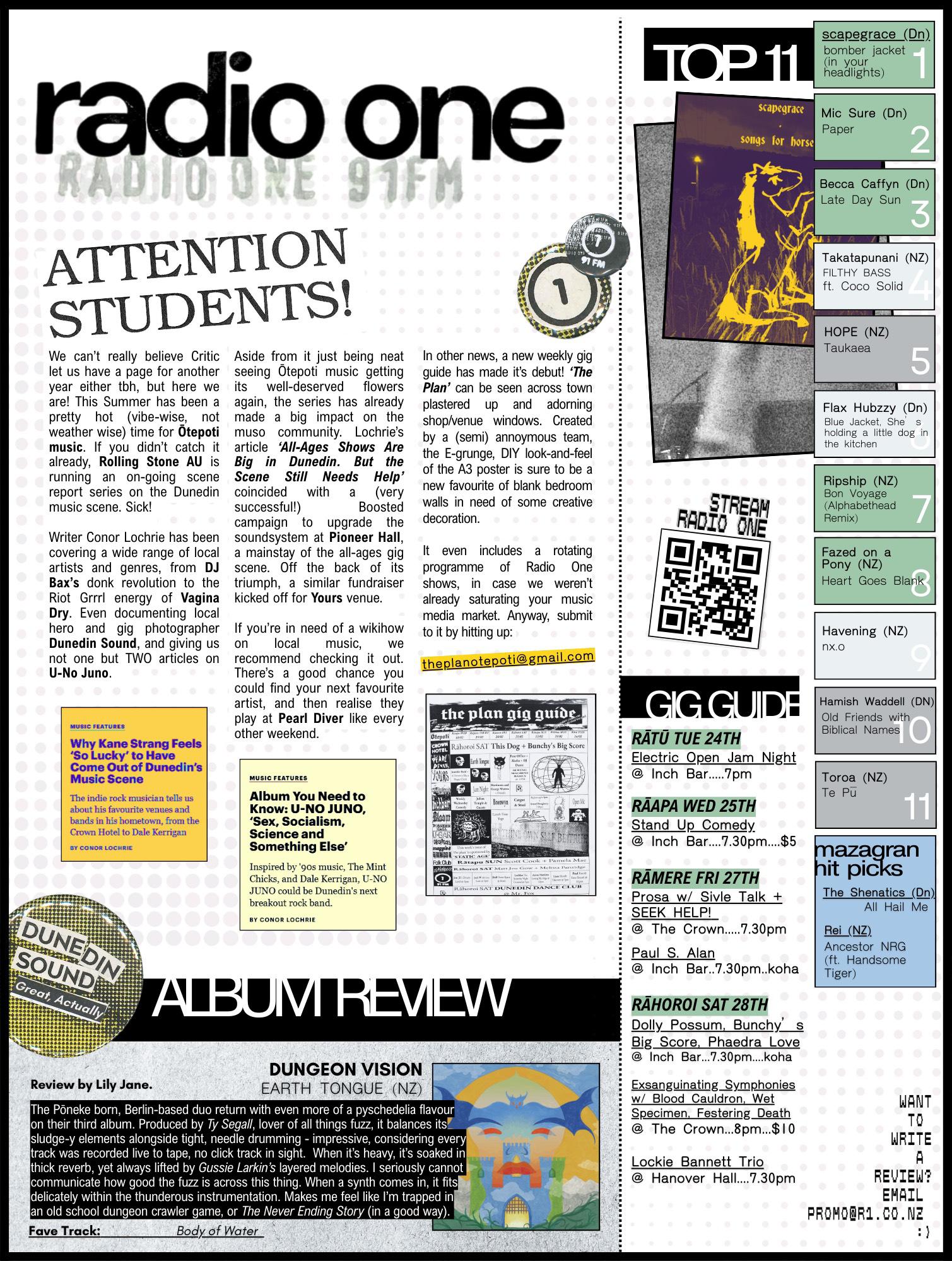Critic Te Ārohi isn’t immune to this change either. As returners will see, things look a little different around here. It’s a new year (heck, actually a new century for us): we're sporting a new logo, fresh look, and a changed print structure. Every other week we will be printing a smaller Critic with 16 pages - but still crammed with puzzles to complain about, news to gossip over, horoscopes to live your life by and the culture articles that are loyally read by our readers to procrastinate. In this issue, Harry’s block-by-block review of George Street and Hanna and Jesse’s deep-dive into the Highlander’s storied history gave us Critic’s own chance to reminisce about the changes to student life over these past few weeks. So whether you’re a North D veteran feeling like you barely recognise the glass-strewn streets of your neighbourhood anymore, or a fresher grappling with the massive change that comes with starting Uni - take every opportunity right now to make memories you will reminisce about. You can strive to make being a student the best experience it can possibly be, while appreciating every host you attend, lazing around with your flatties or going on those random late-night side quests. Just remember, change may be inevitable, but you are living through a period of time where you get to try new opportunities, fuck around and find out. Your few years at Ōtākou Whakaihu Waka will go by in the blink of an eye. Cheap OUSA lunches will always be by your side, fuelling your online shopping spree during lectures - just don’t let the years waste away while you yearn for those ‘good old days’.