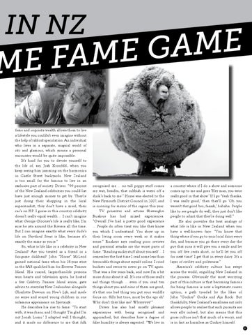 a country where if I do a show and someone comes up to me and goes ‘Hey man, you were really good in that show.’ If I go ‘Yeah thanks, I was really good,’ then they’ll go ‘Oh you weren’t that good bro, faaark,’ hahaha. People like to see people do well, they just don’t like people to admit that they’re doing well.” He also provides the best analogy of what life is like in New Zealand when you have a well-known face: “You know that thing where if you go to your local dairy every day, and because you go there every day the guy that runs it will give you a smile and let you off five cents short, or he’ll let you off for next time? I get that in every dairy. It’s a layer of civility and politeness.” America’s celebrity culture has swept across the world, engulfing New Zealand in the process. Obviously the most worrying part of this culture is that becoming famous for being famous is now a legitimate career option, a path treaded by the likes of John “Cocksy” Cocks and Aja Rock. But thankfully, New Zealand’s smallness not only allows people to realise that such pursuits are very silly indeed, but also means that this gross culture isn’t that much of a worry, and is in fact as harmless as Cocksy himself. 21