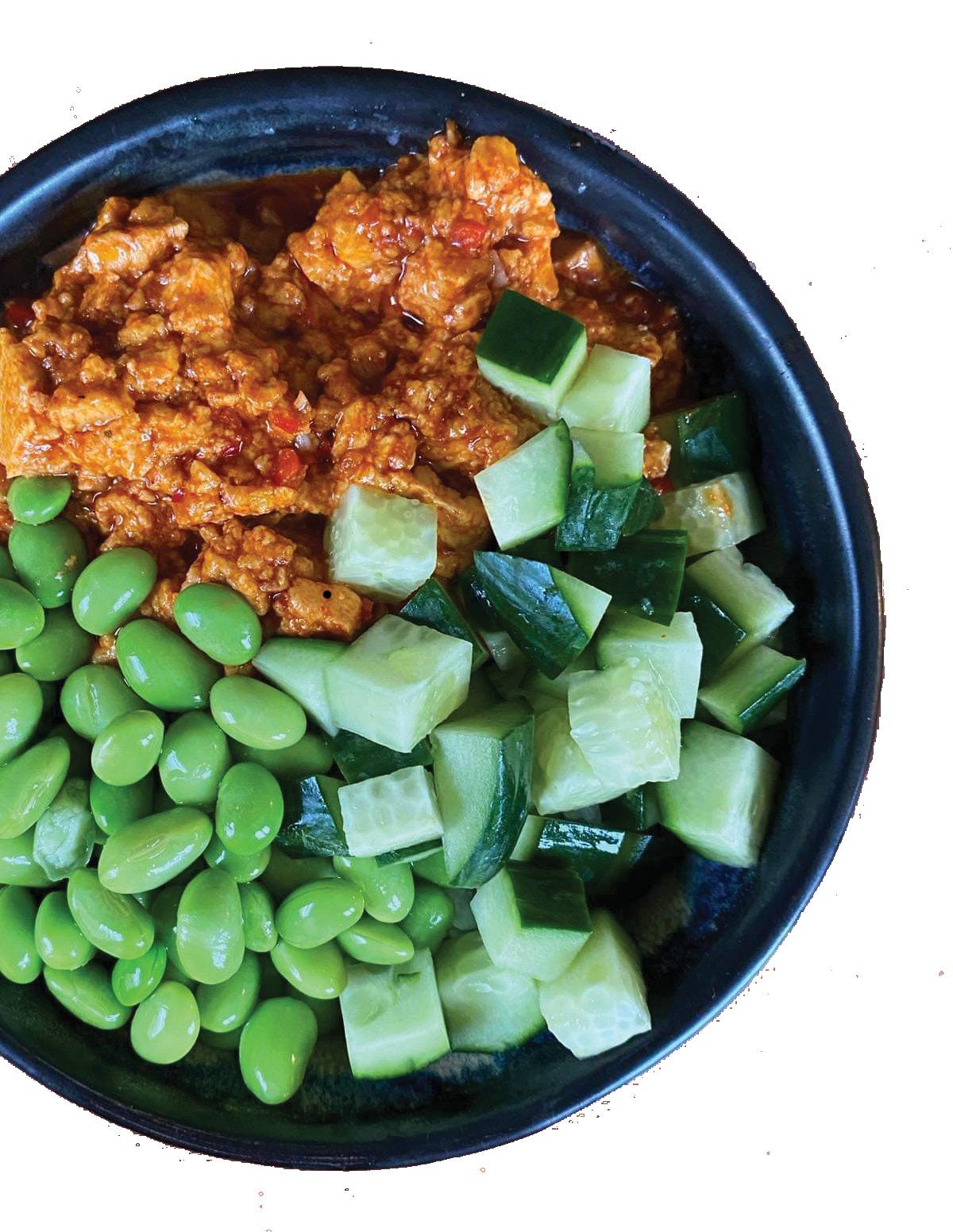Step 3: Once your tofu and rice are cooked, cut your cucumber into cubes, and pour some hot water over your edamame beans. Let the beans sit for about a minute and then drain.
