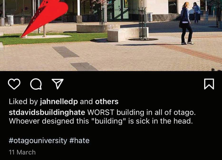 St David Lecture Theatre has been suffering under the tirade of an Instagram account dedicated purely to chatting shit about the building. Boasting a current total of 19 followers and 9 posts, @stdavidsbuildinghate is true to their handle. The page’s bio states: “I HATE st davids literally the worst building [in] New Zealand.”