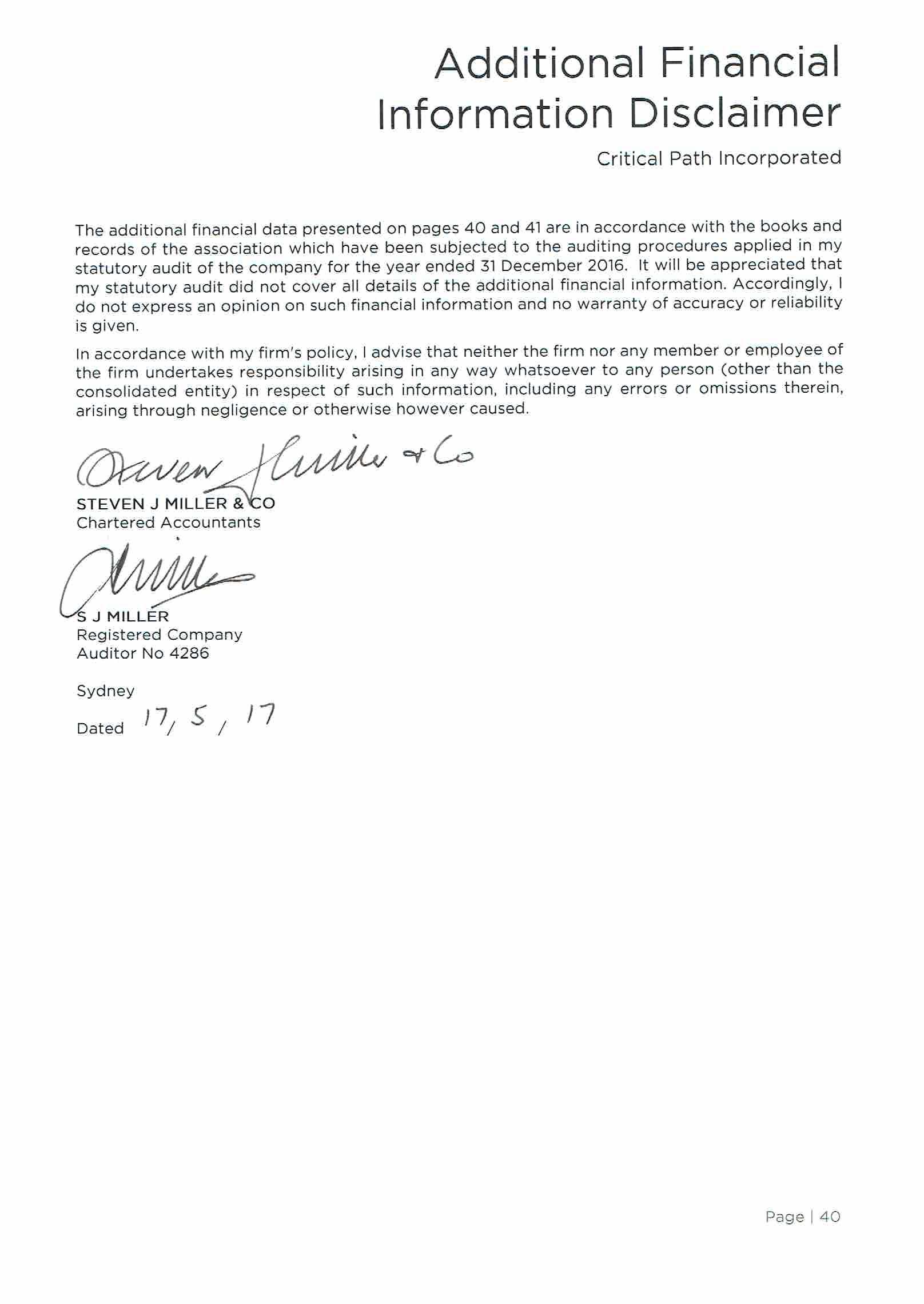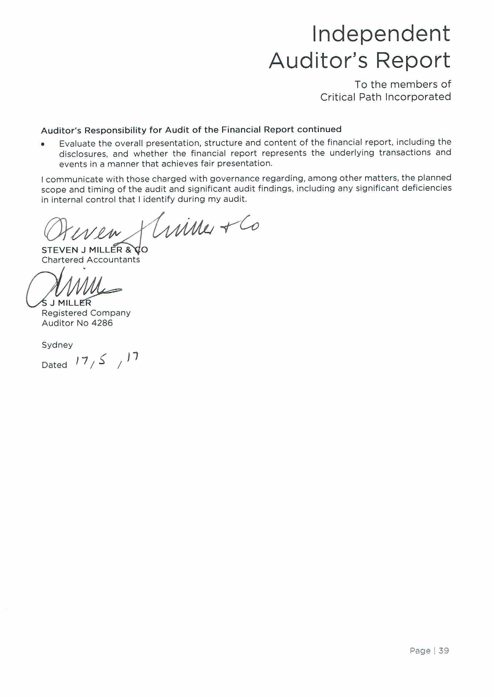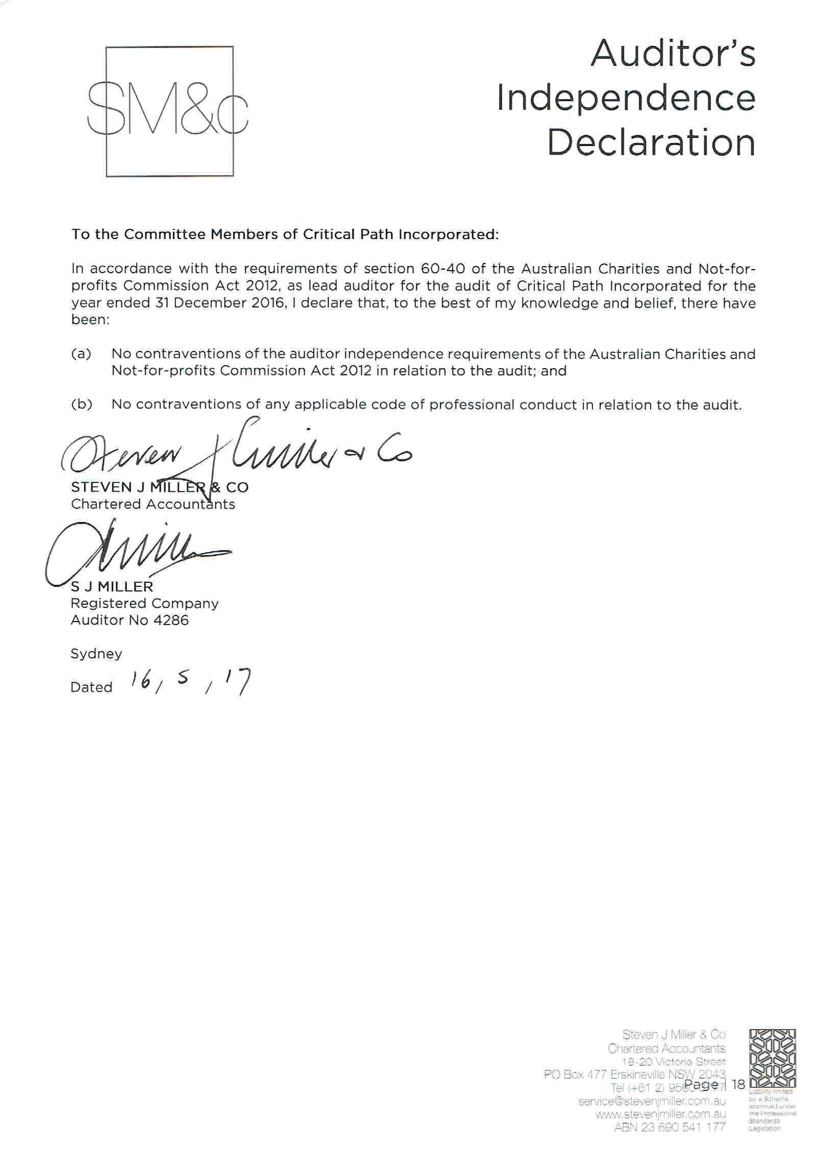 I have audited the financial report of Critical Path Incorporated, which comprises the statement of financial position as at 31 December 2016, the statement of surplus or deficit and other comprehensive income, statement of changes in equity and statement of cash flows for the year then ended, and notes to the financial statements, including a summary of significant accounting policies, and the Committee members’ declaration.
