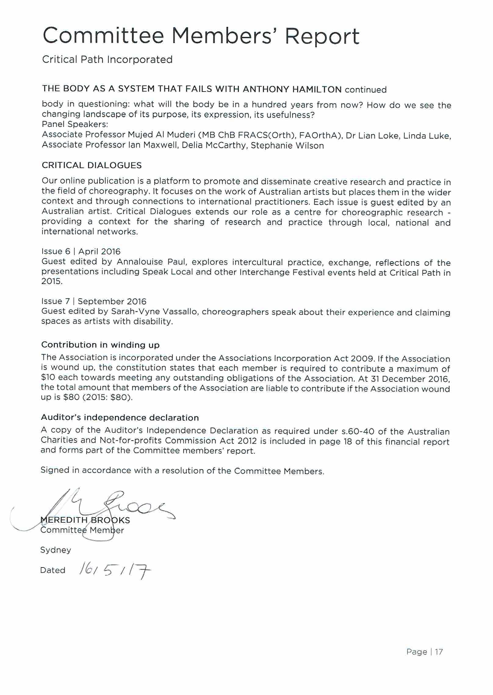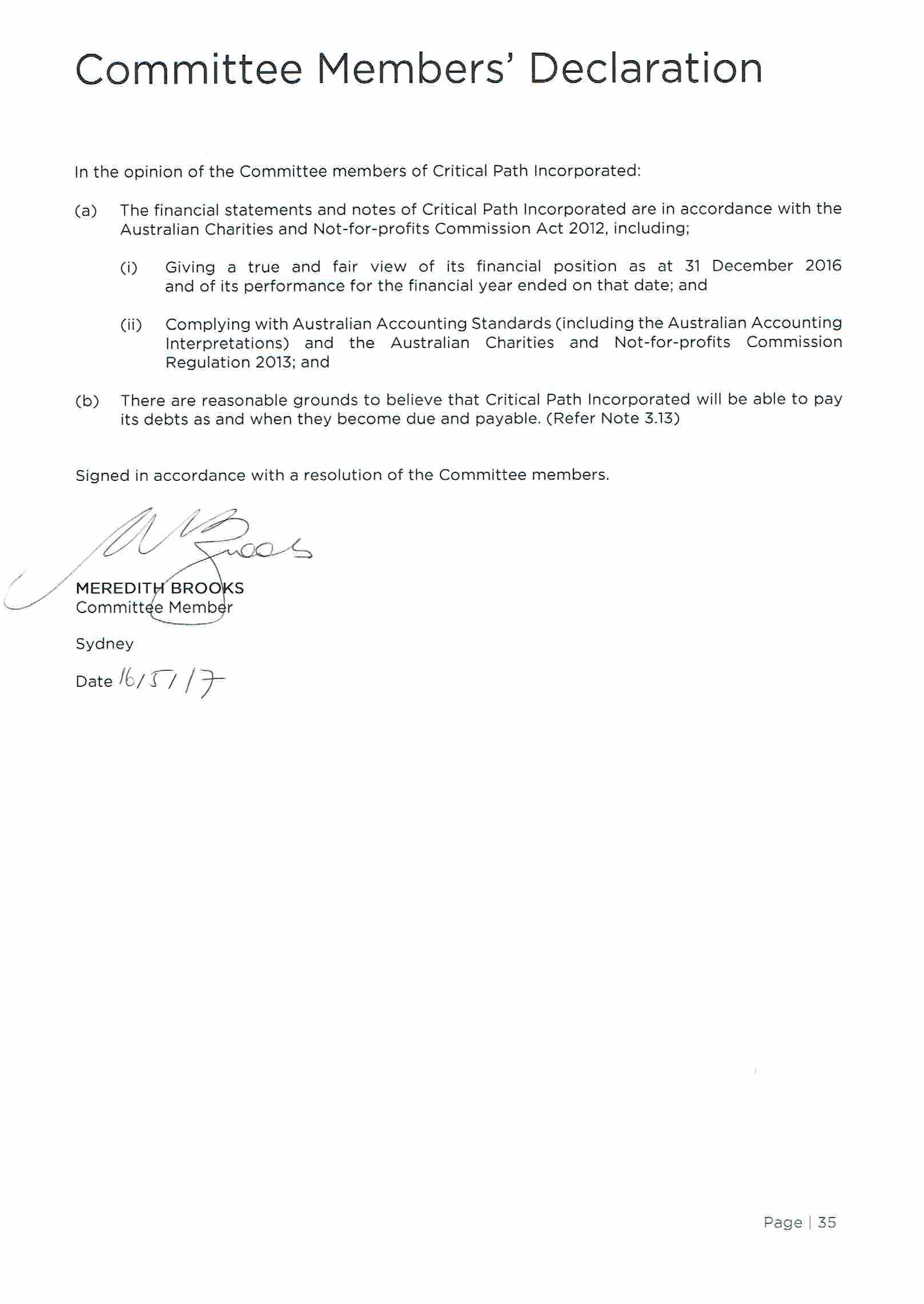 The Committee members of Critical Path Incorporated present their Report together with the financial statements for the year ending 31 December 2016 and the Independent Audit report, covering those financial statements.