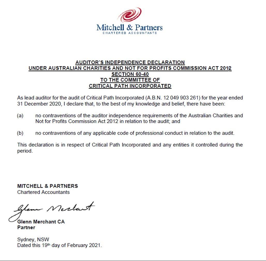 We have audited the financial report of Critical Path Incorporated (the association), which comprises the statement of financial position as at 31 December 2020, the statement of comprehensive income, statement of changes in equity, statement of cash flows for the year ended on that date, a summary of significant accounting policies and other explanatory notes and the committees’ declaration.