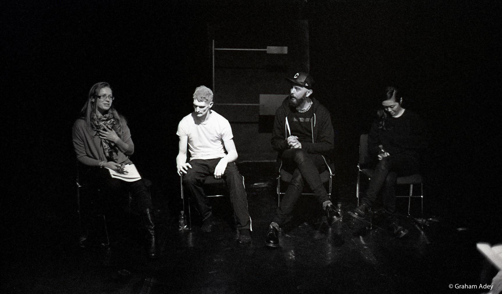 Dan Daw, choreographer Martin Forsberg, designer Jenny Nordberg and Candoco Co-Artistic Director Stine Nilsen in post-show conversation following the work-in-progress sharing of BEAST. Photograph by Graham Adey.