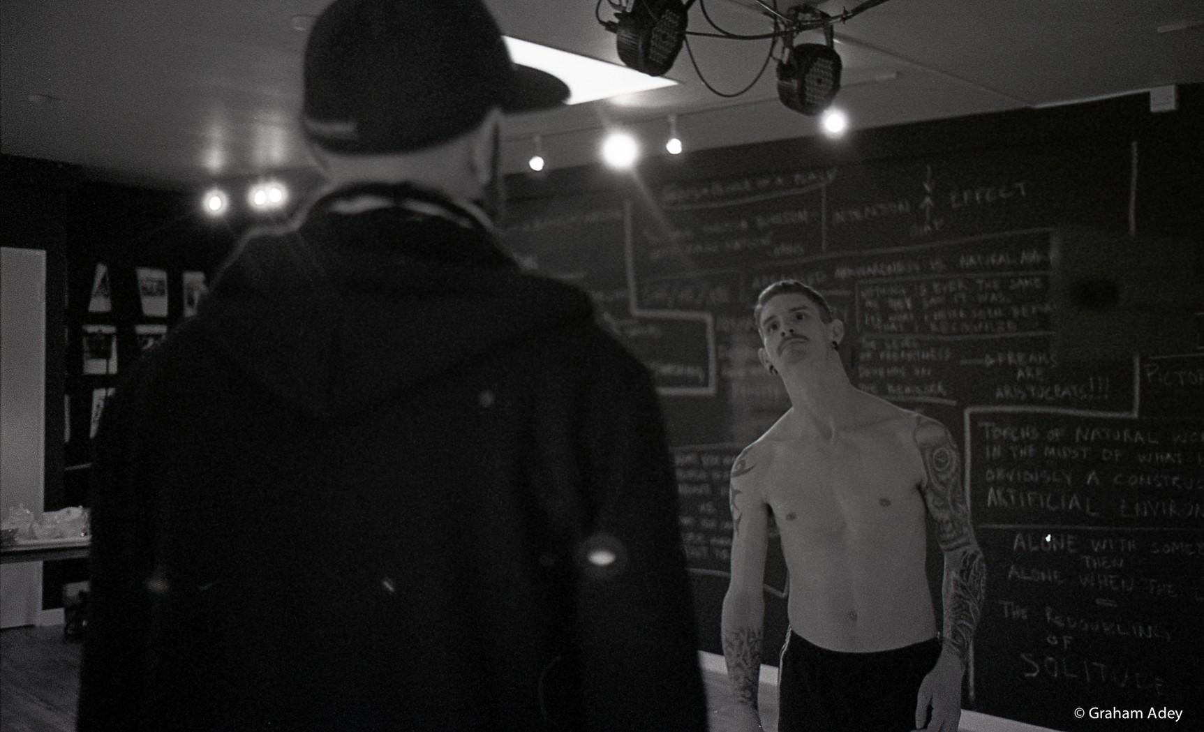 Dan Daw in research and development for BEAST. Pictured with choreographer, Martin Forsberg. Photograph by Graham Adey