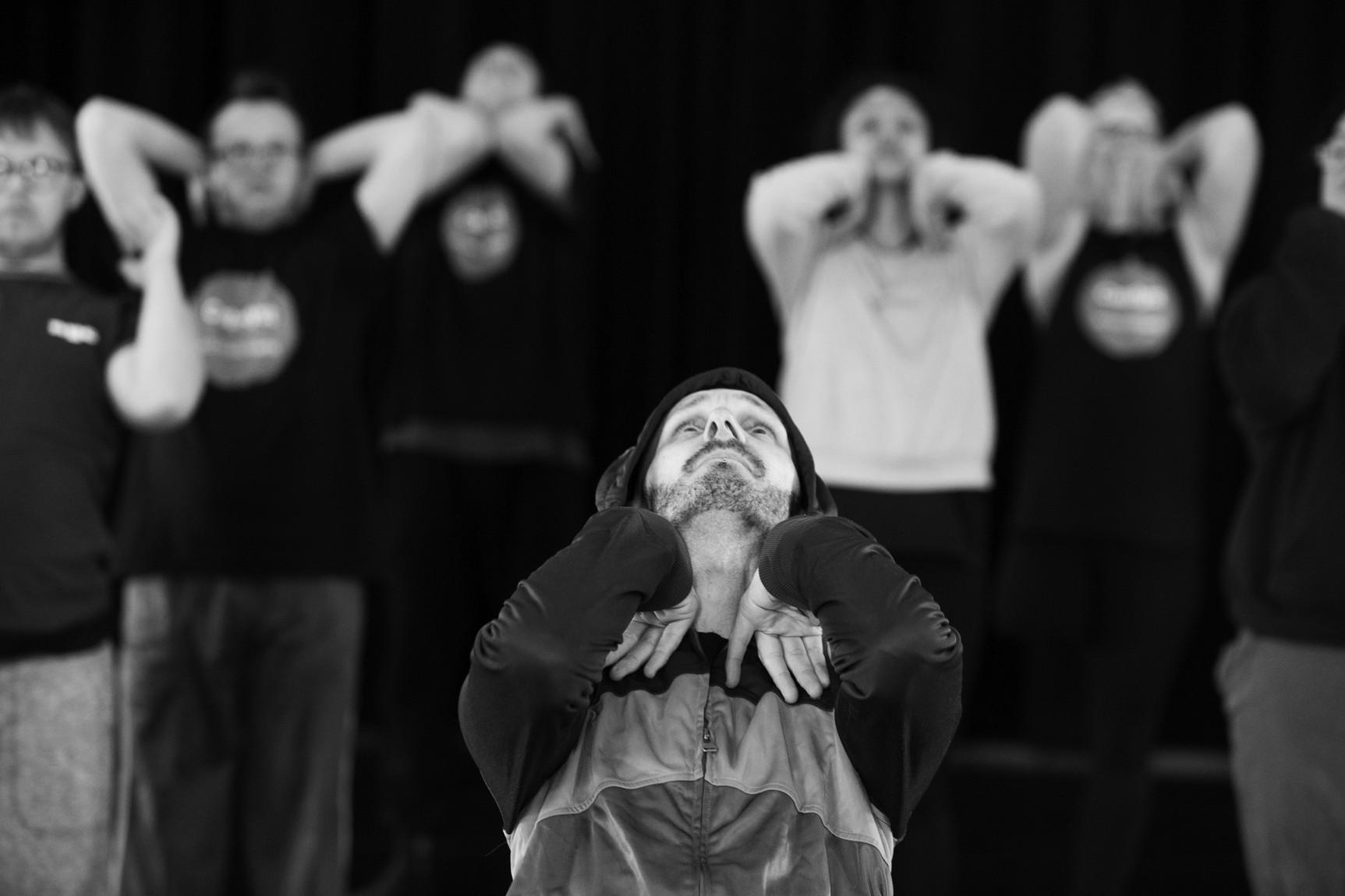 Murmuration Artists in a cluster all on different levels intertwined. One artist is centred and reaching out with her crutch. Black and white. Photograph by Gisella Vollmer.