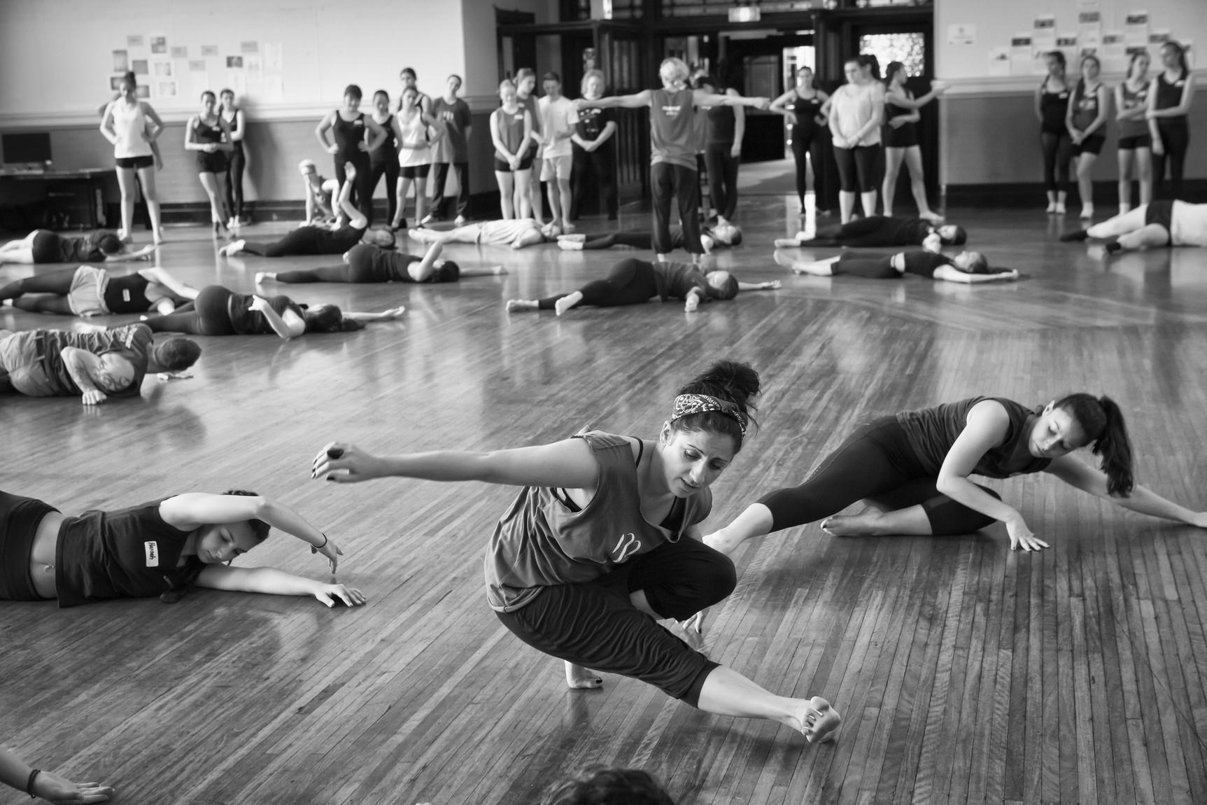 Sarah-Vyne demonstrating a rolling task arm and leg stretched out along the floor a dozen students rolling behind her at the Murmuration arts and education day. Photograph by Gisella Vollmer.