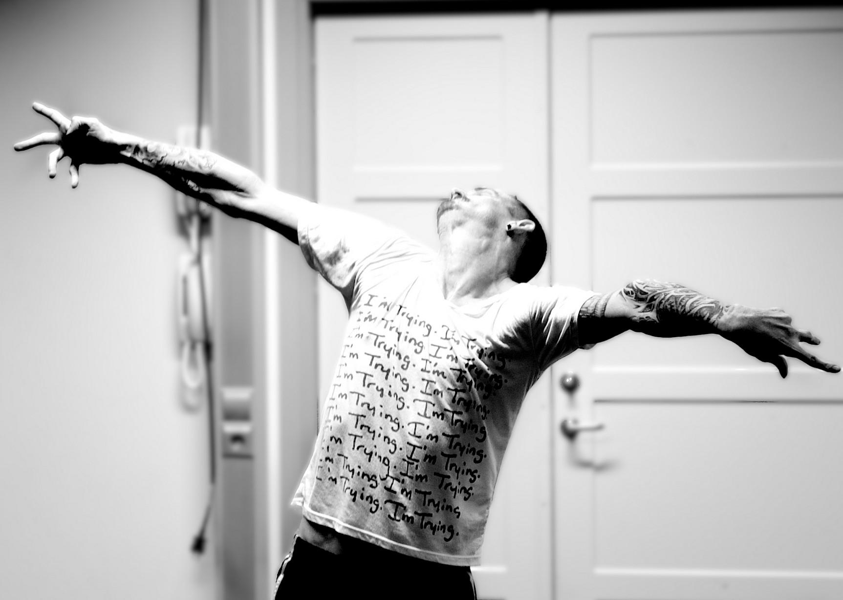 Dan Daw stretching out his arms performing the work-in-progress sharing of ON ONE CONDITION at Danscentrum Syd, Malmö Photograph by Nelson Rodriguez-Smith.