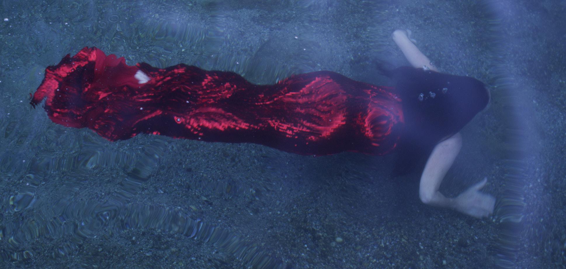 Liz Lea from above, swimming in a red dress - Photo Credit: Nino Tamburri