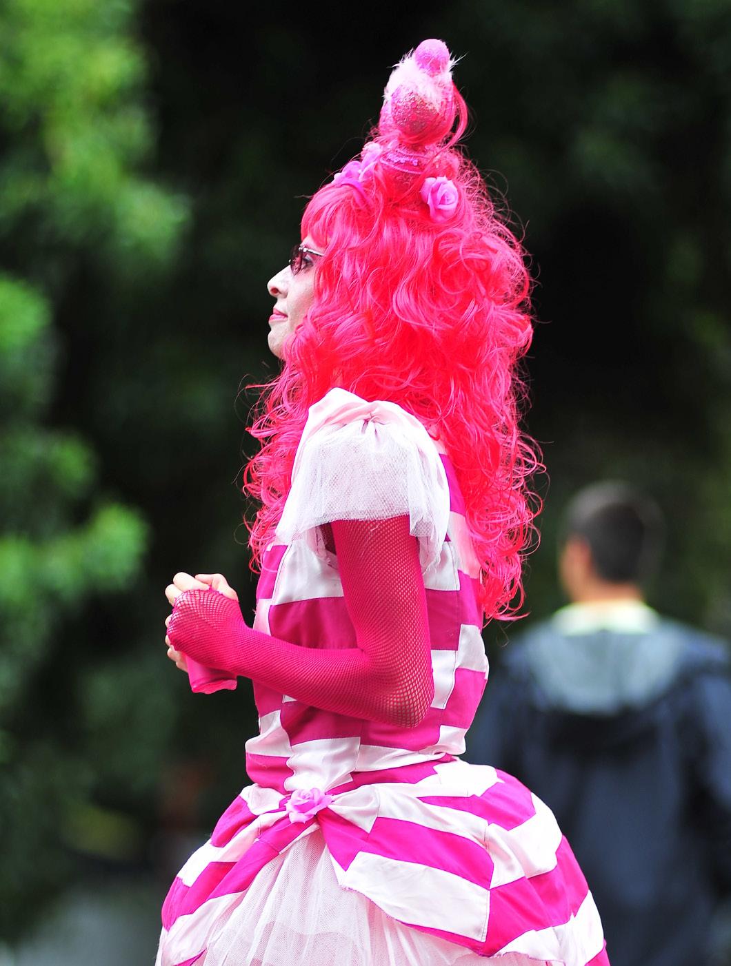 Person in a pink costume and wig, facing sideways, with arms bent at the Candelo Village Festival - Photo Credit: Paul McIver