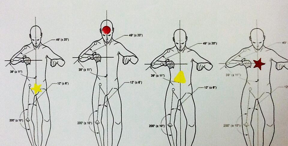 Diagrams of bodies are labelled with red and yellow stickers - Image courtesy the artist, 2014